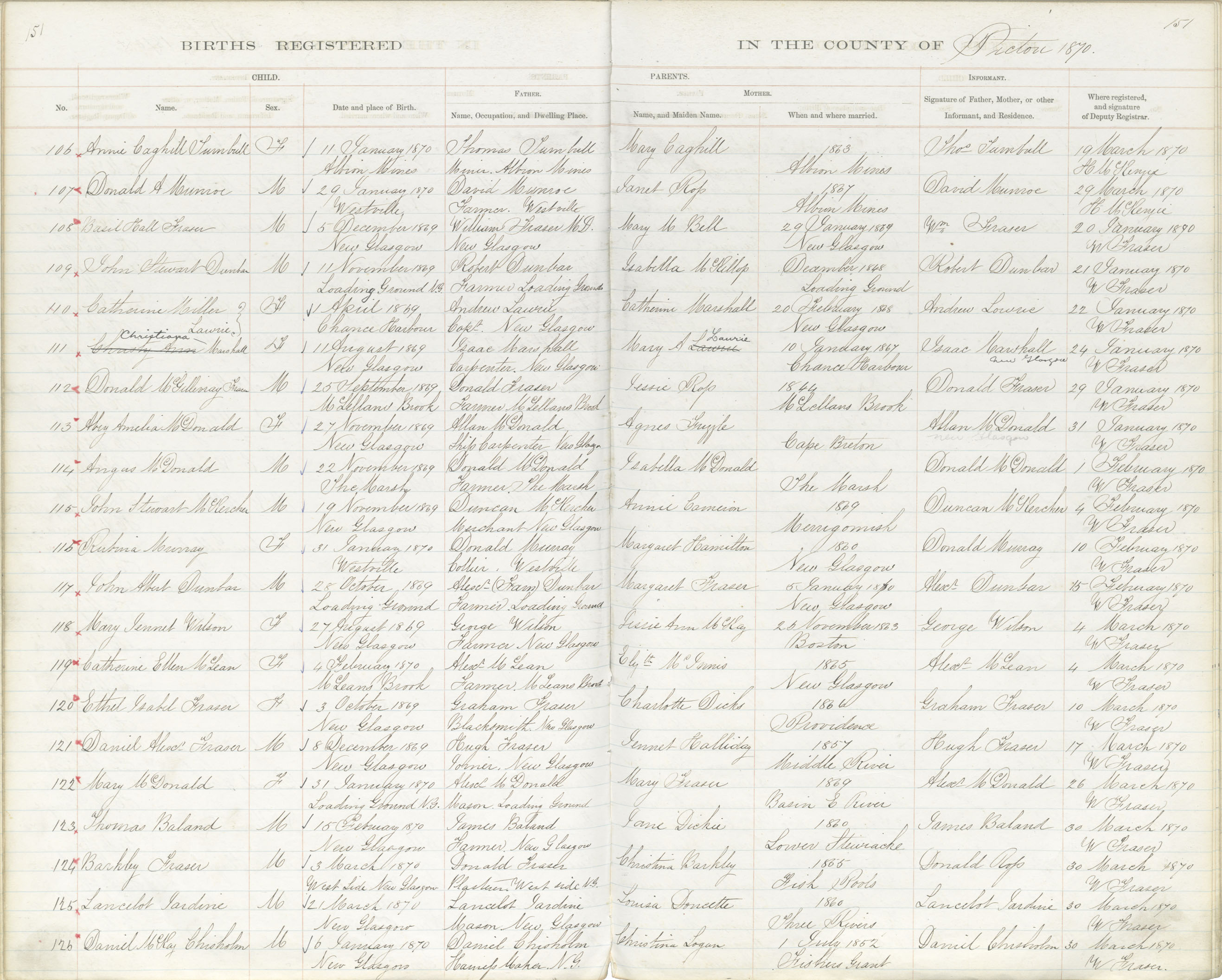 Birth Registration: Year: 1870 book: 1818 page: 151 number: 126
