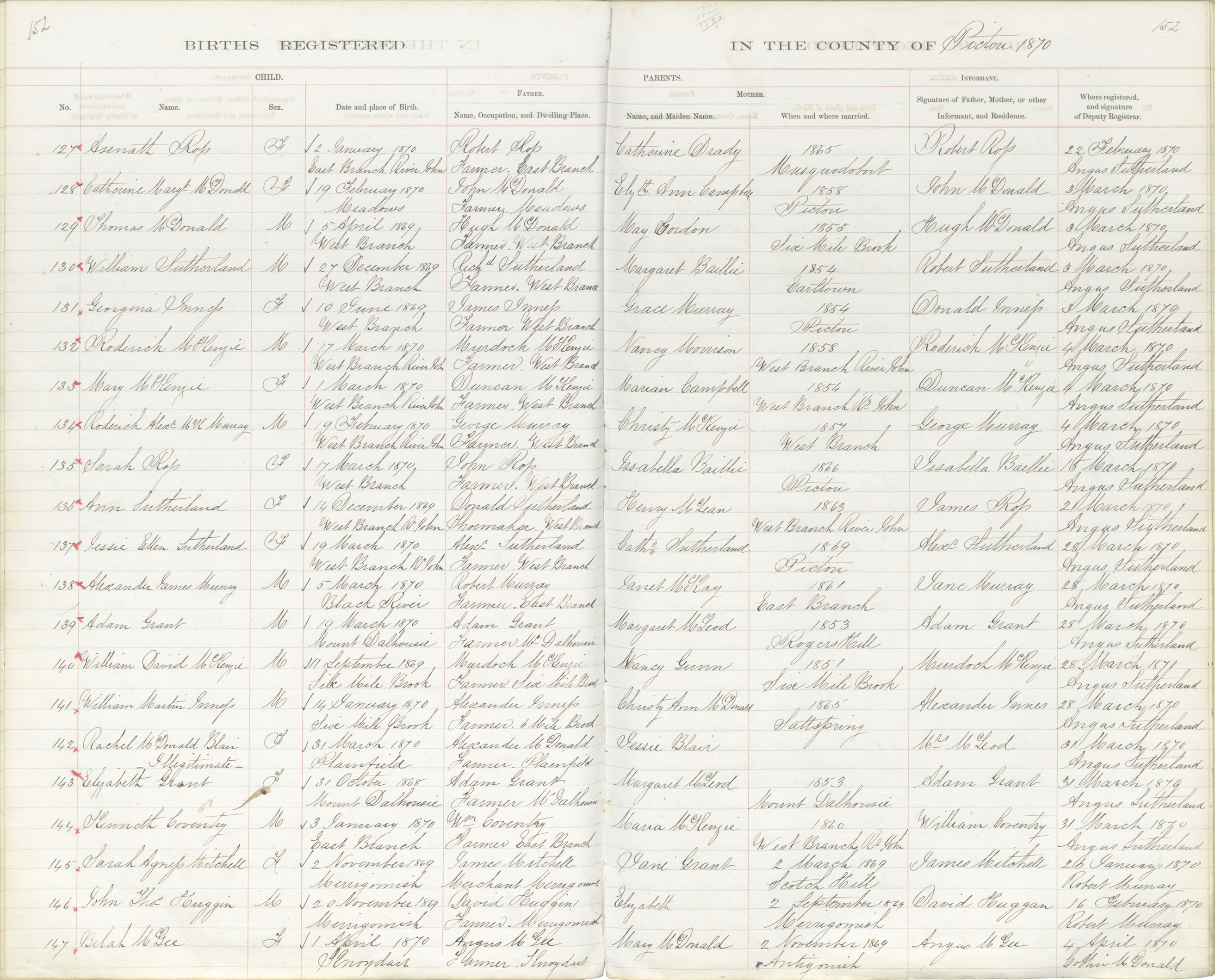 Birth Registration: Year: 1870 book: 1818 page: 152 number: 147