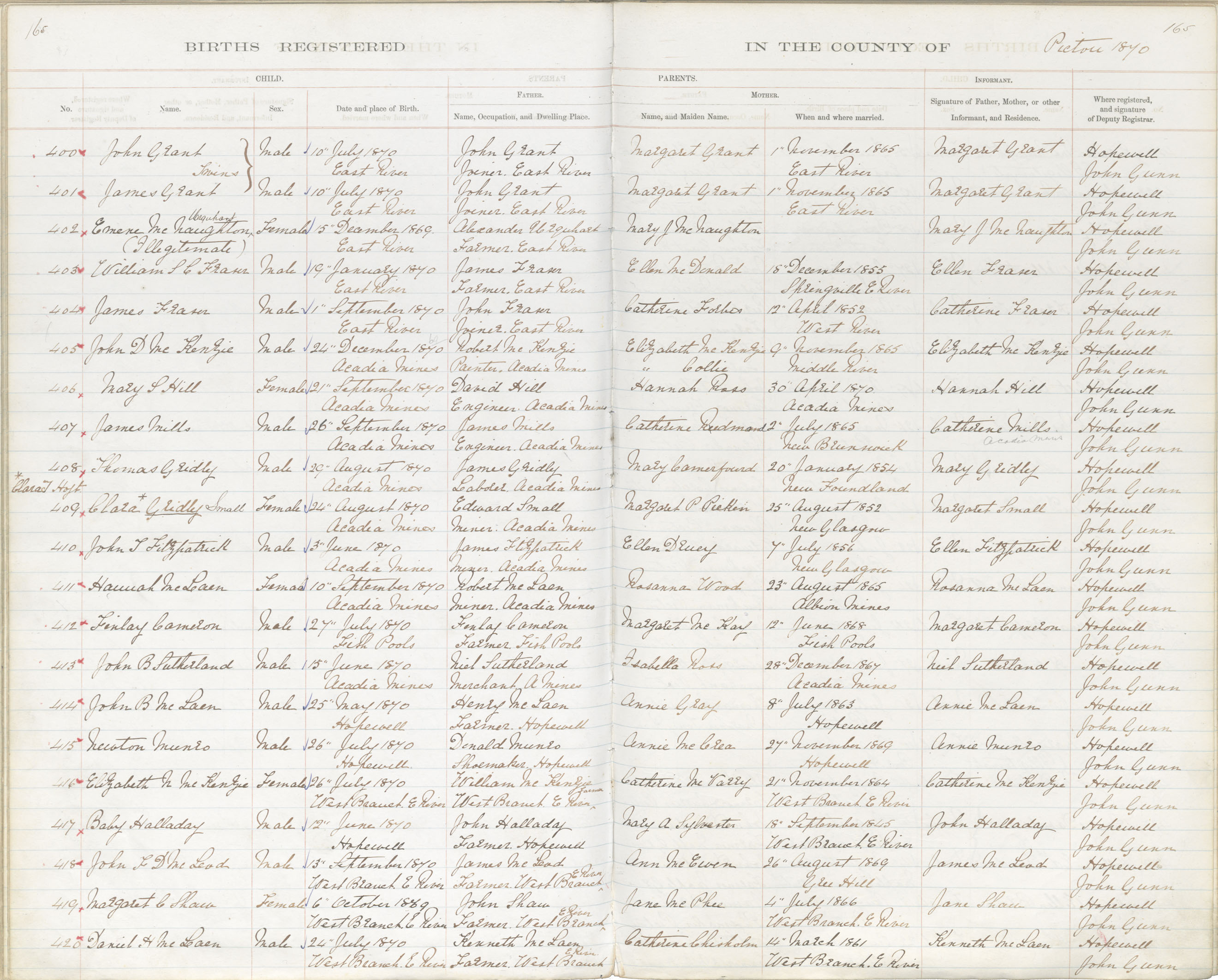Birth Registration: Year: 1870 book: 1818 page: 165 number: 420