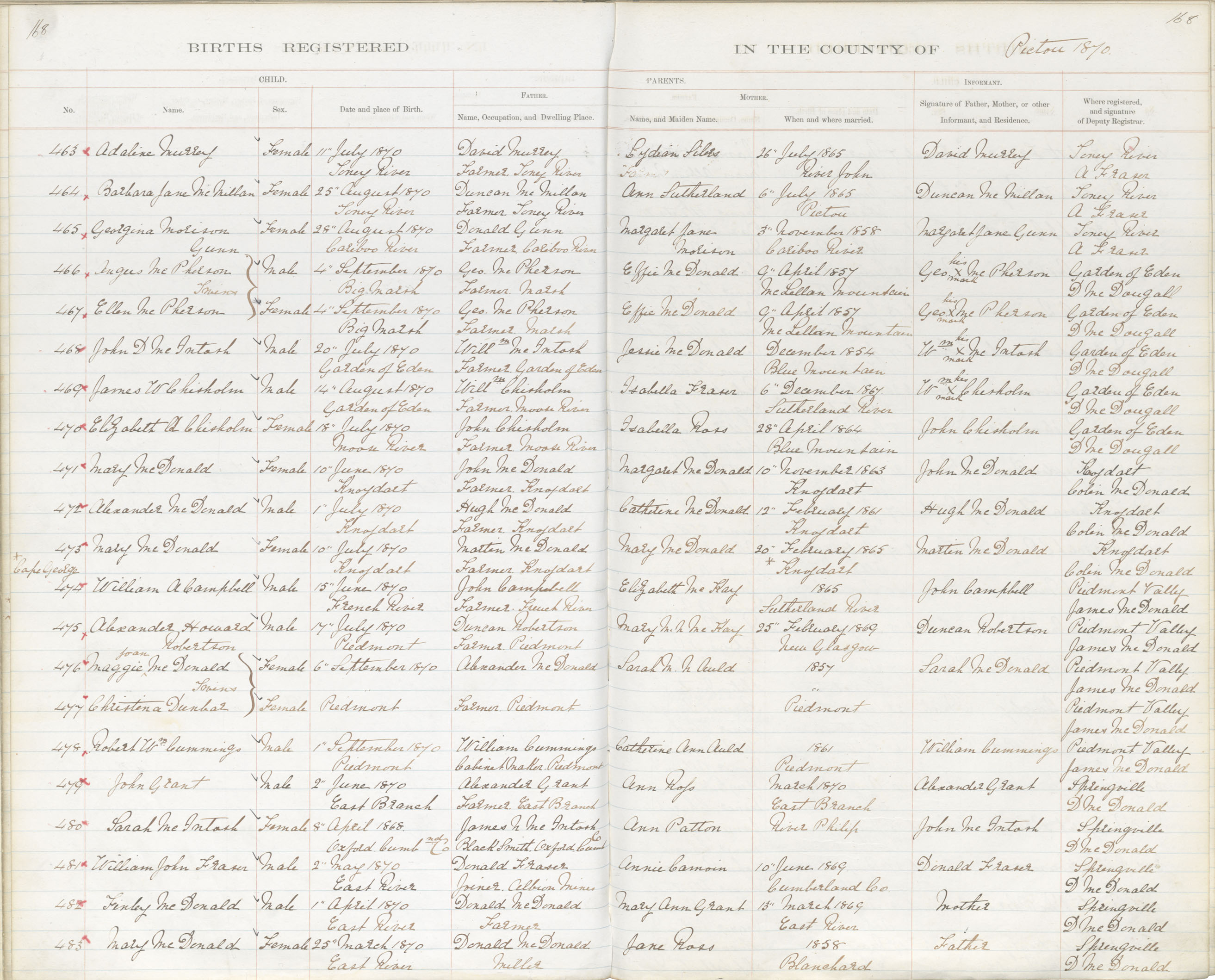 Birth Registration: Year: 1870 book: 1818 page: 168 number: 482