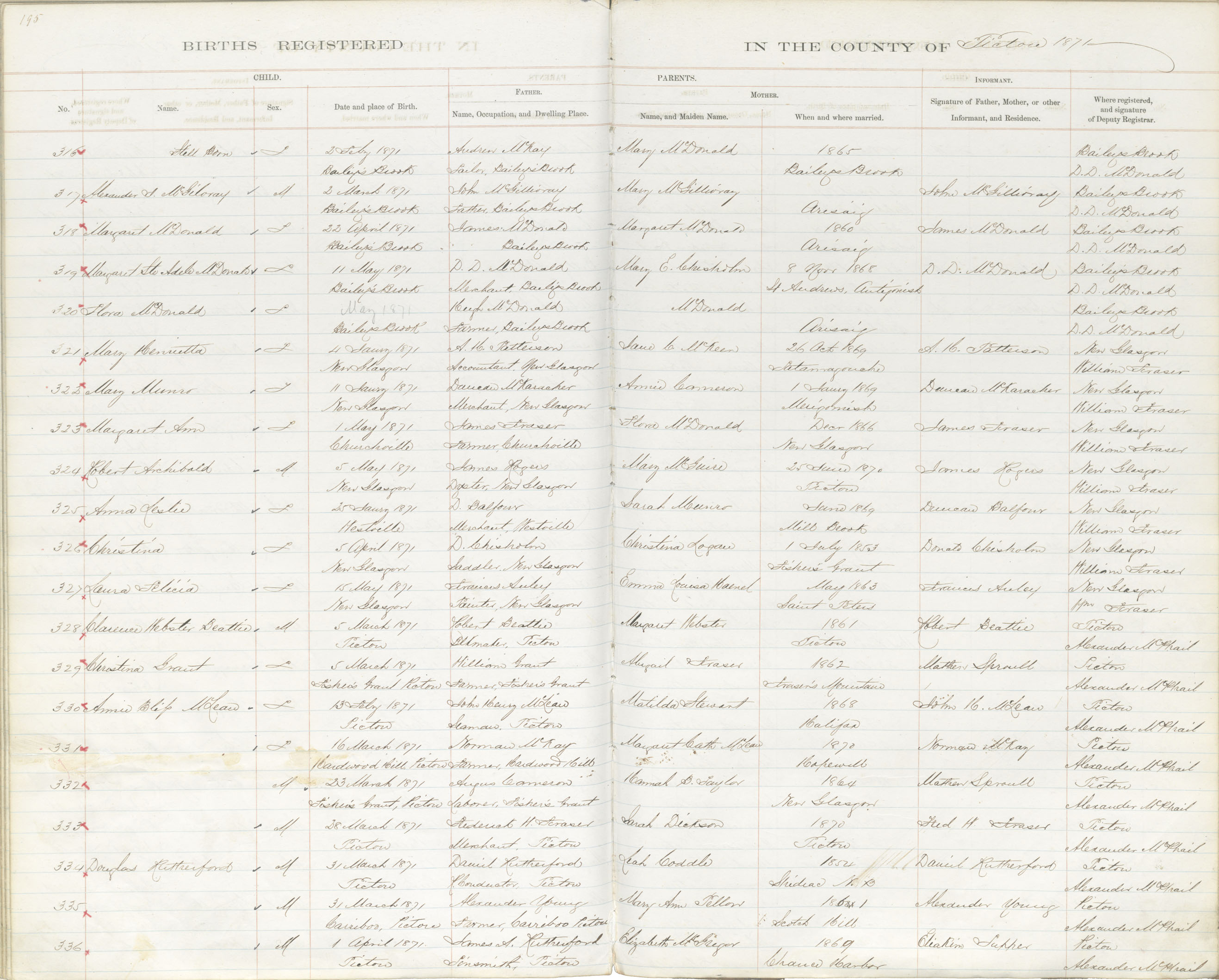 Male Birth Registration: Year: 1871 book: 1818 page: 195 number: 336