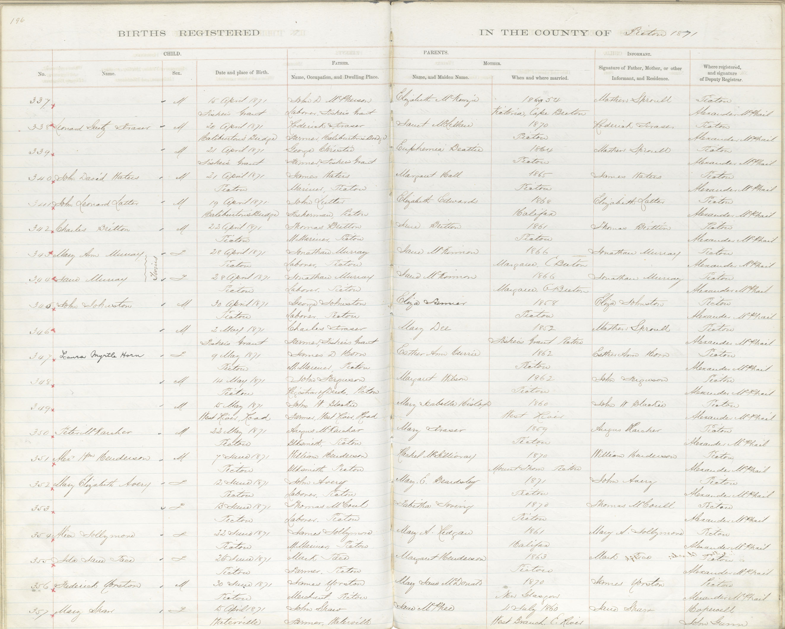 Birth Registration: Year: 1871 book: 1818 page: 196 number: 357