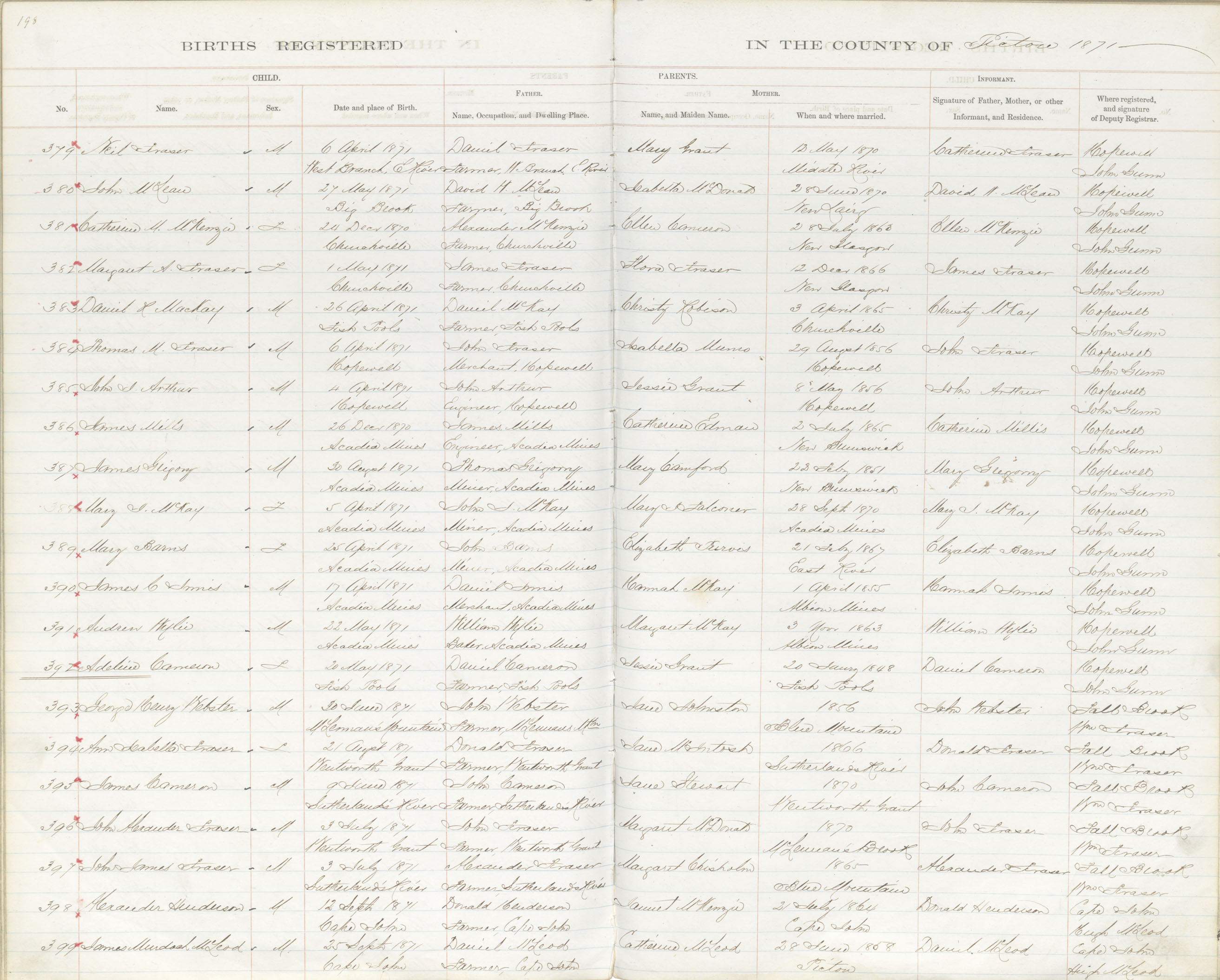 Birth Registration: Year: 1871 book: 1818 page: 198 number: 399