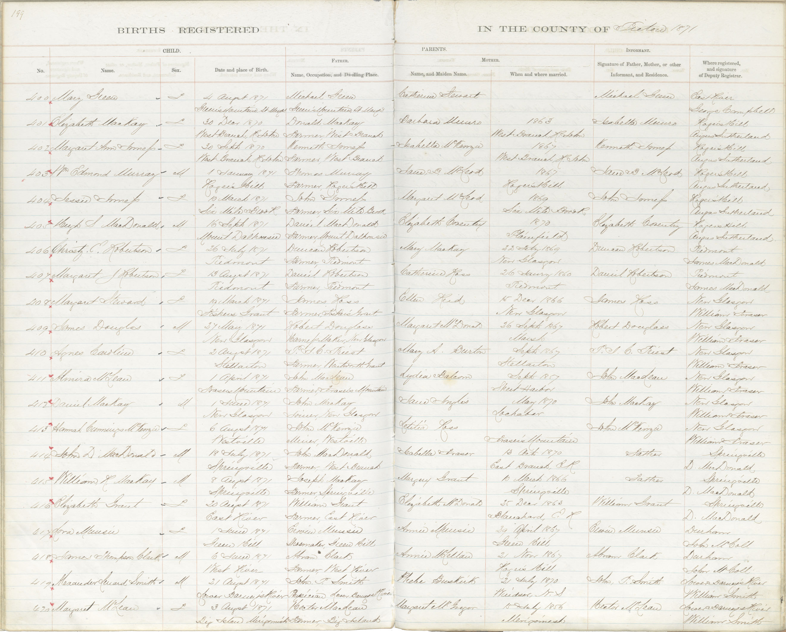 Birth Registration: Year: 1871 book: 1818 page: 199 number: 414