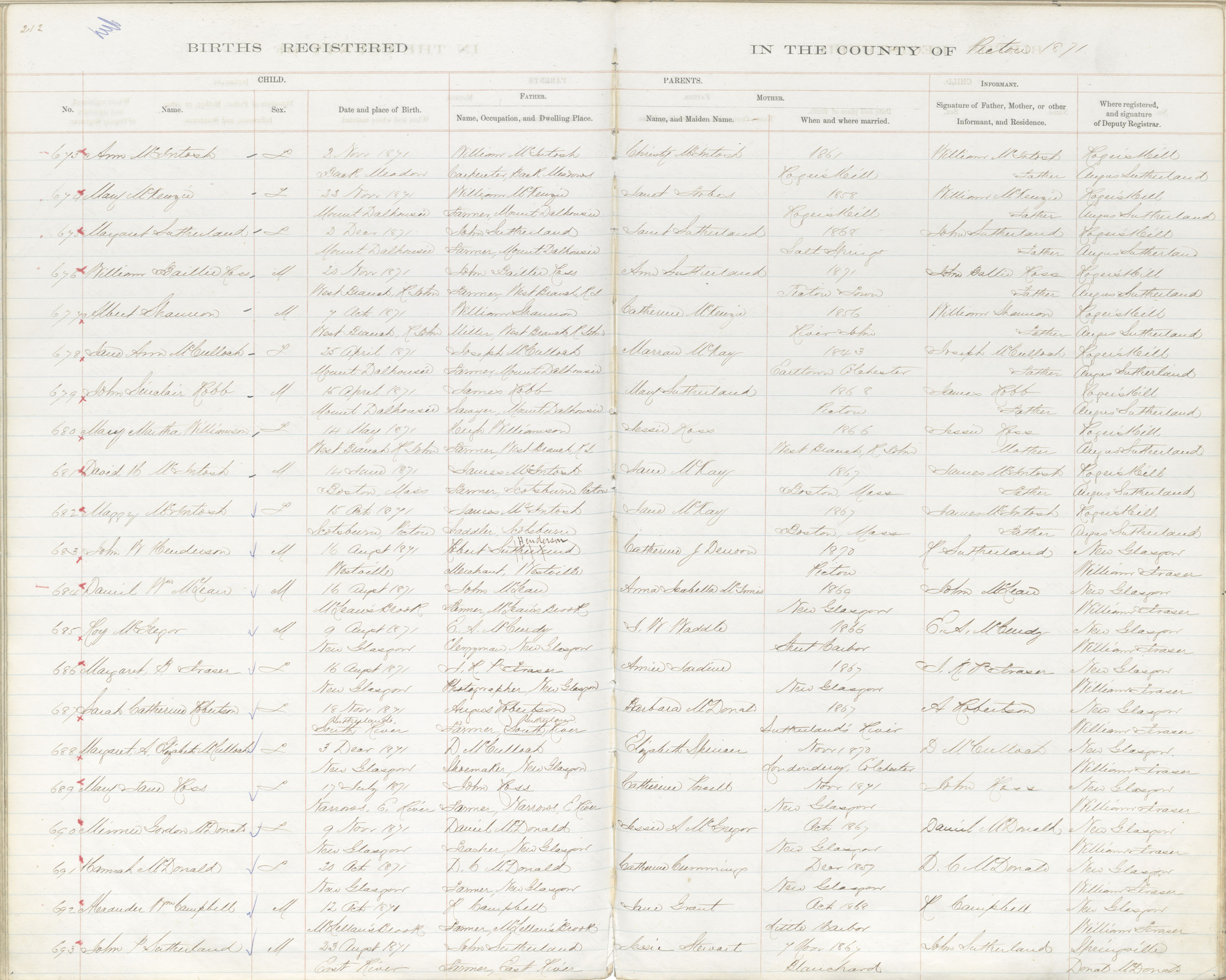 Birth Registration: Year: 1871 book: 1818 page: 212 number: 693