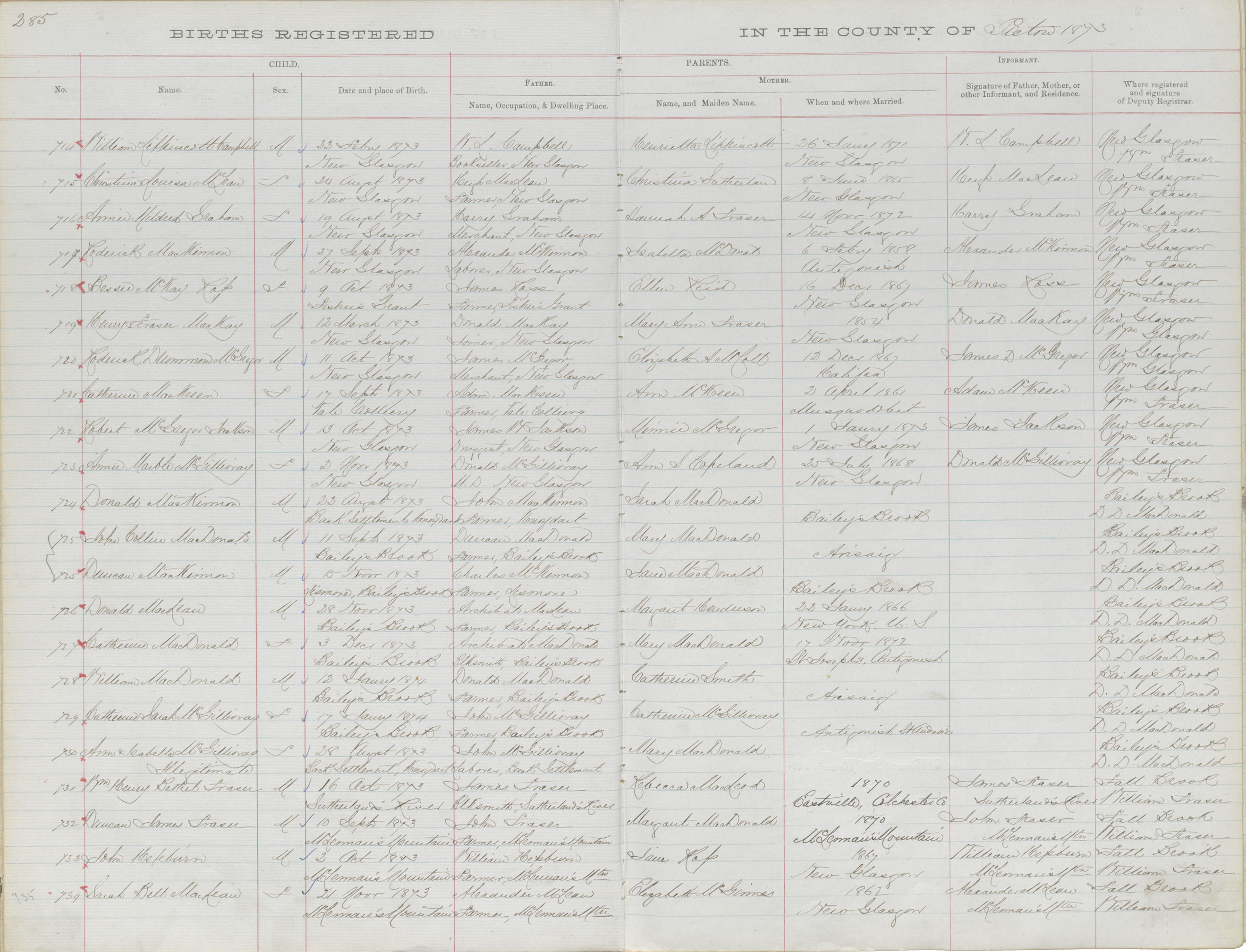 Birth Registration: Year: 1873 book: 1818 page: 285 number: 727