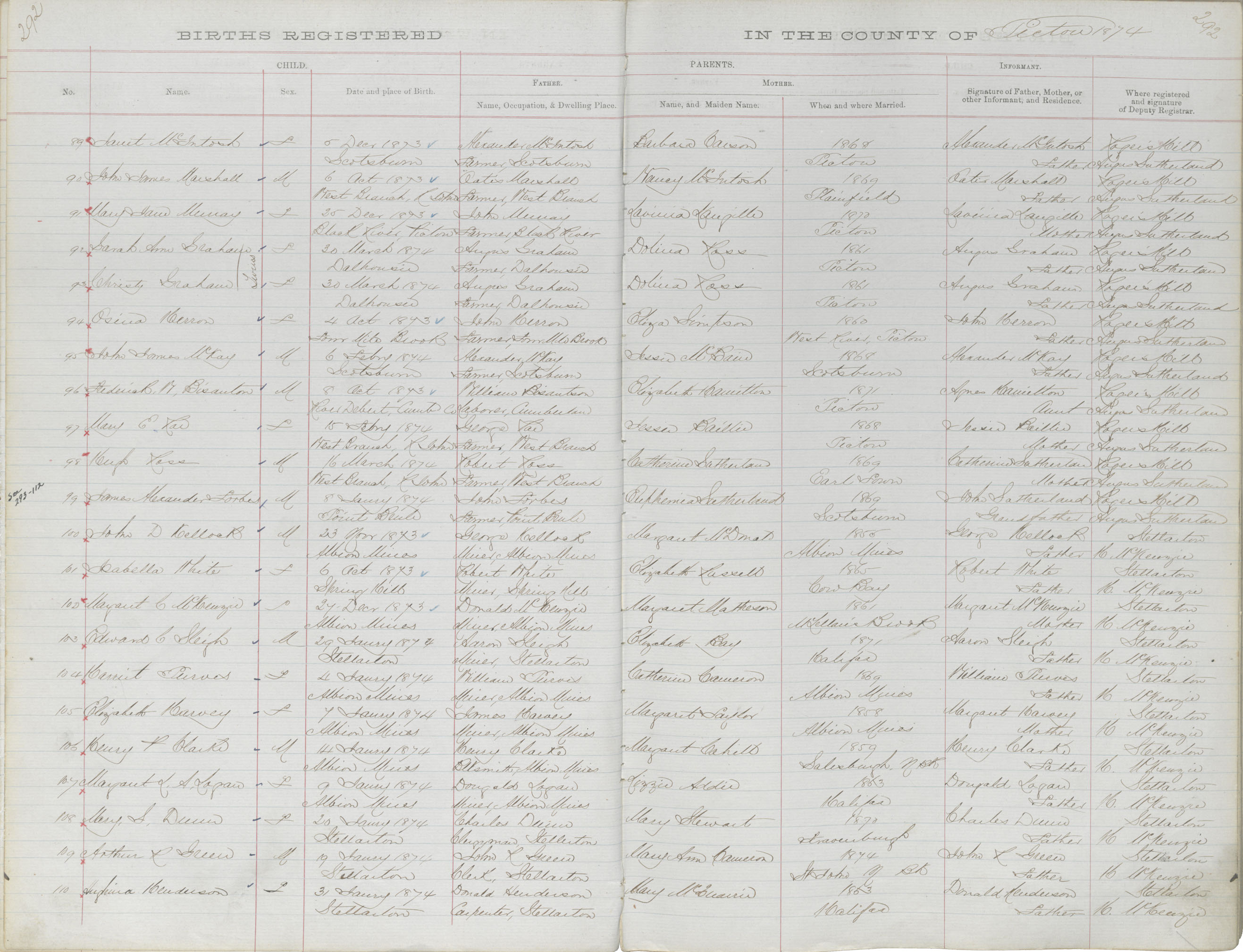 Birth Registration: Year: 1874 book: 1818 page: 292 number: 110