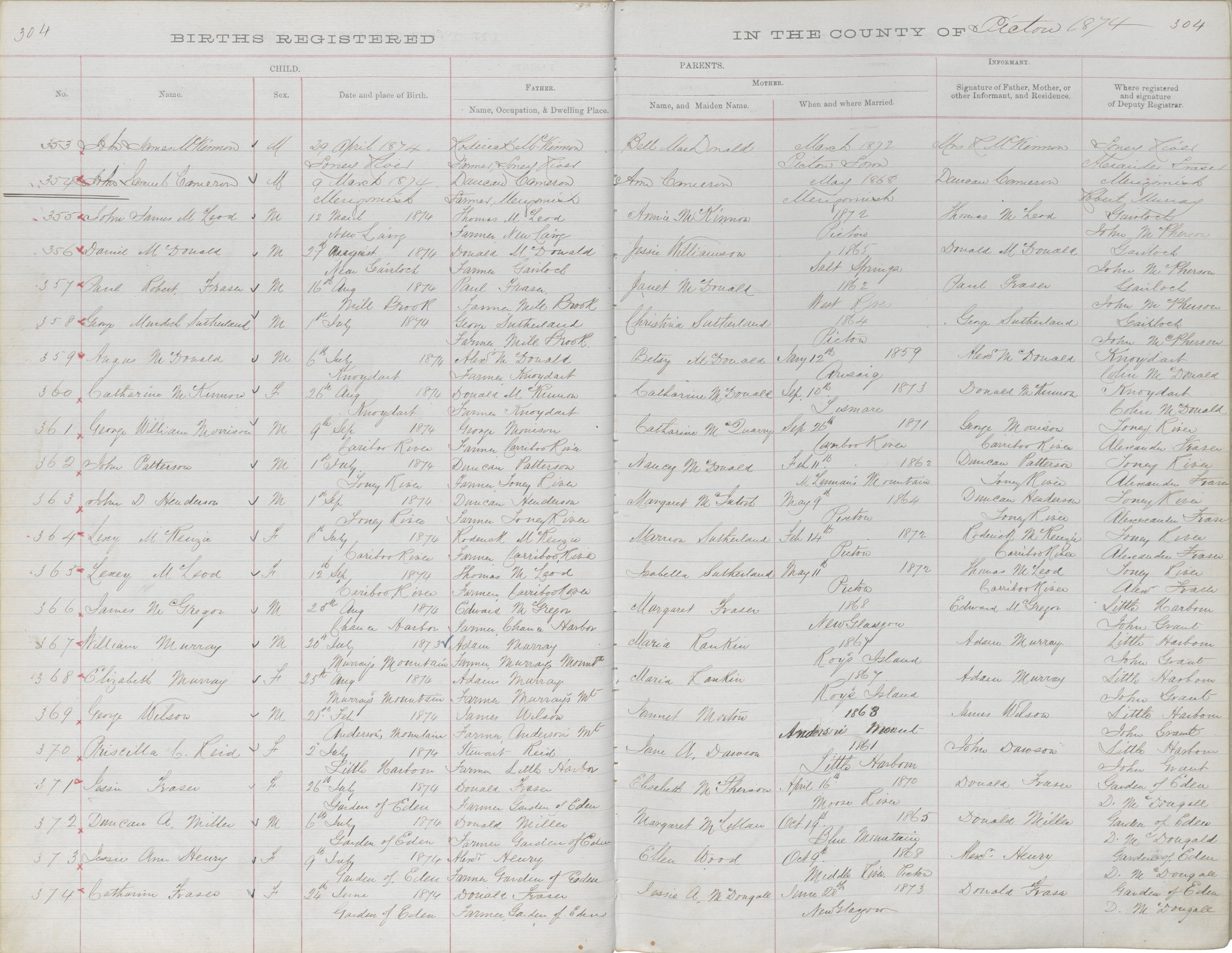 Birth Registration: Year: 1874 book: 1818 page: 304 number: 353