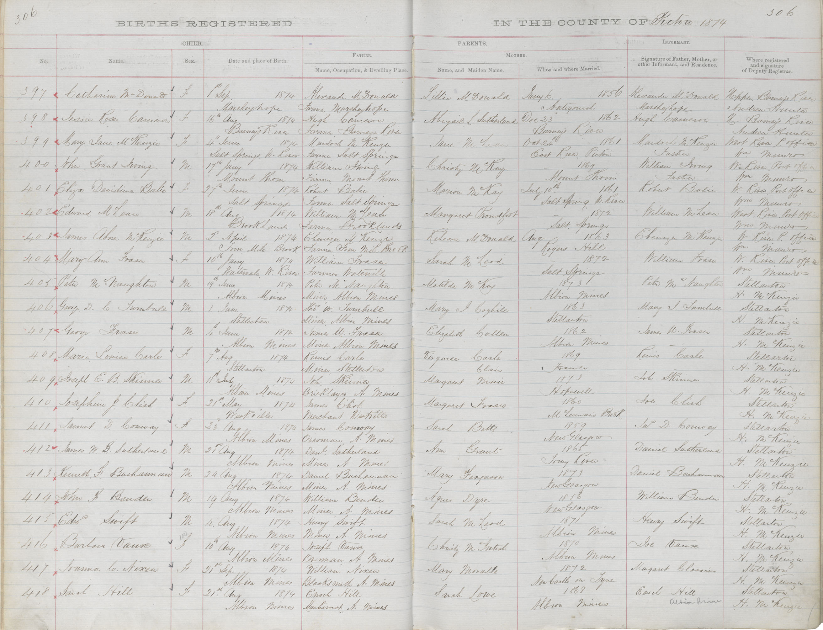 Birth Registration: Year: 1874 book: 1818 page: 306 number: 397