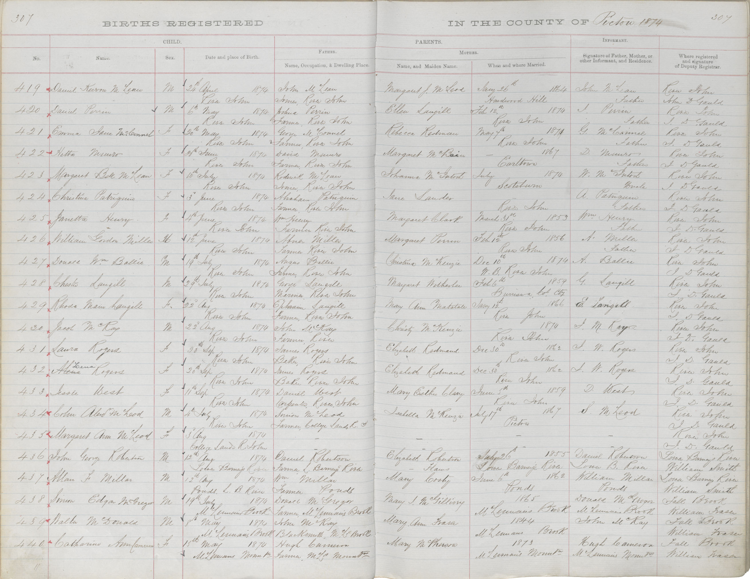 Female Birth Registration: Year: 1874 book: 1818 page: 307 number: 398