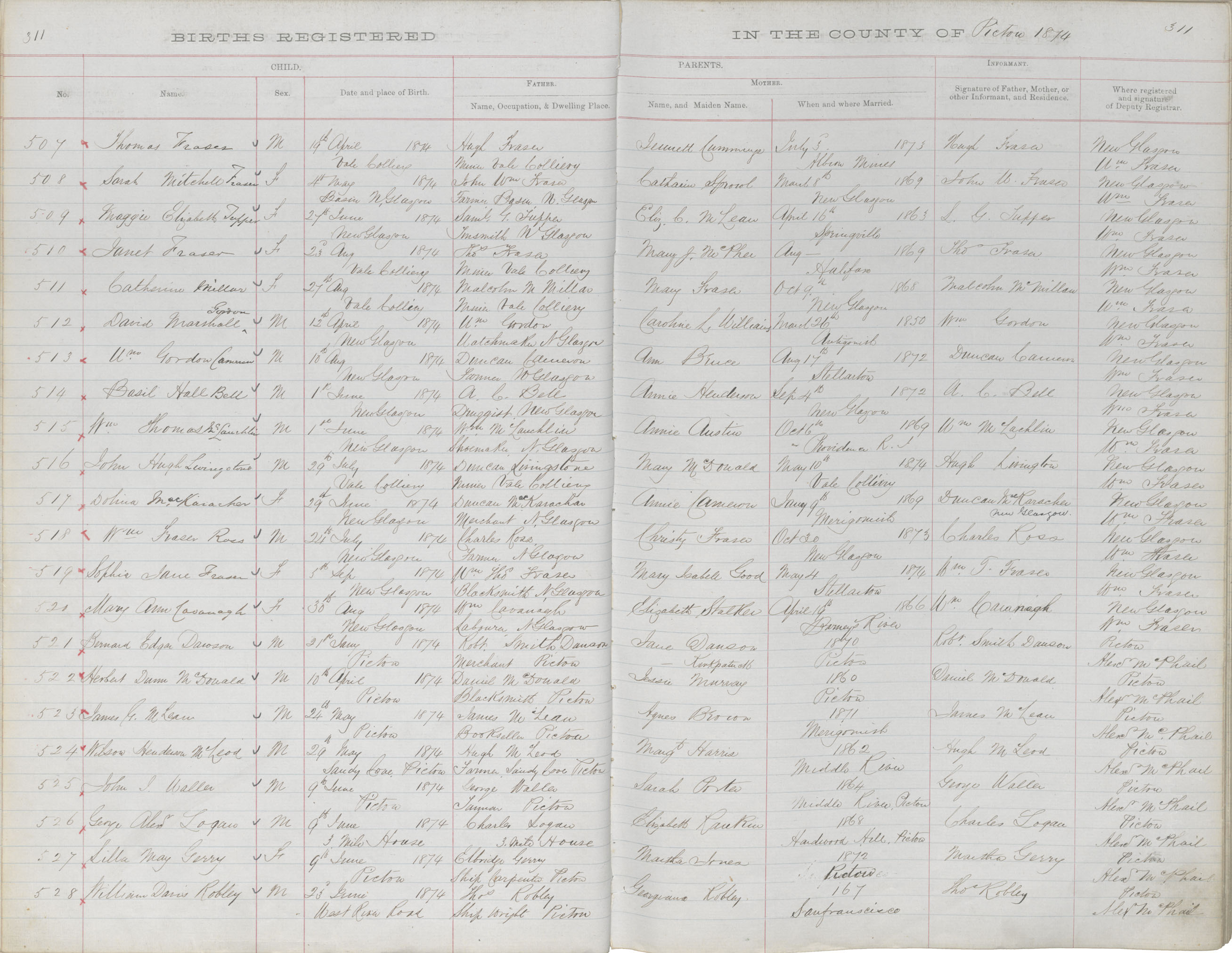 Birth Registration: Year: 1874 book: 1818 page: 311 number: 507