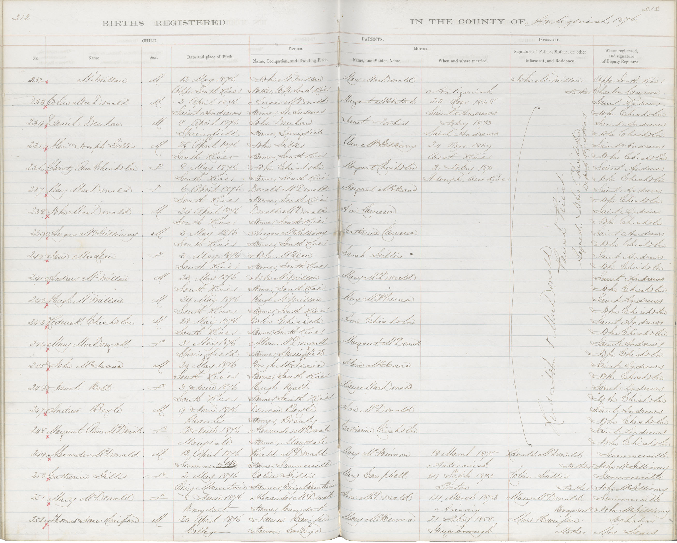 Birth Registration: Year: 1876 book: 1802 page: 212 number: 252