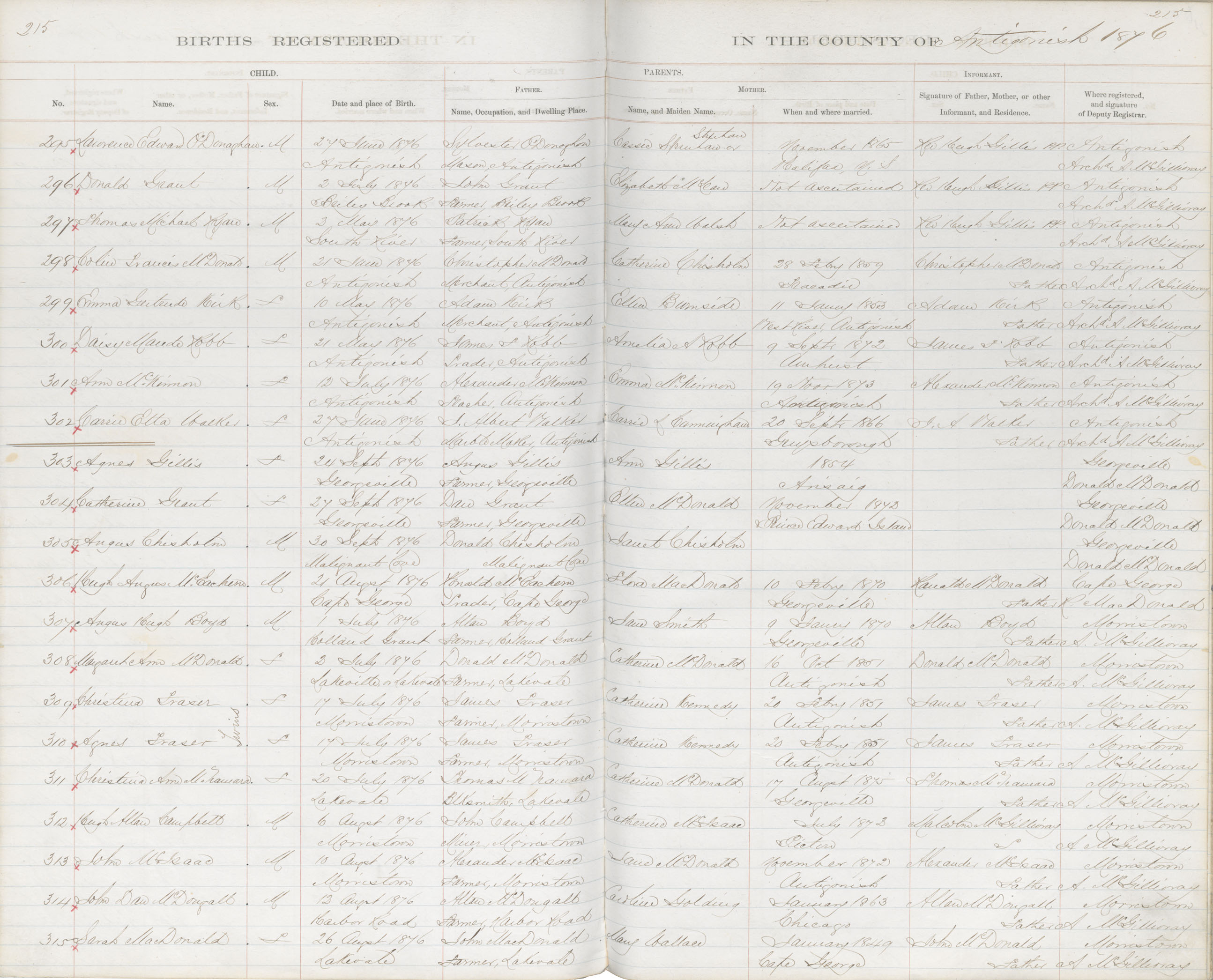 Birth Registration: Year: 1876 book: 1802 page: 215 number: 315