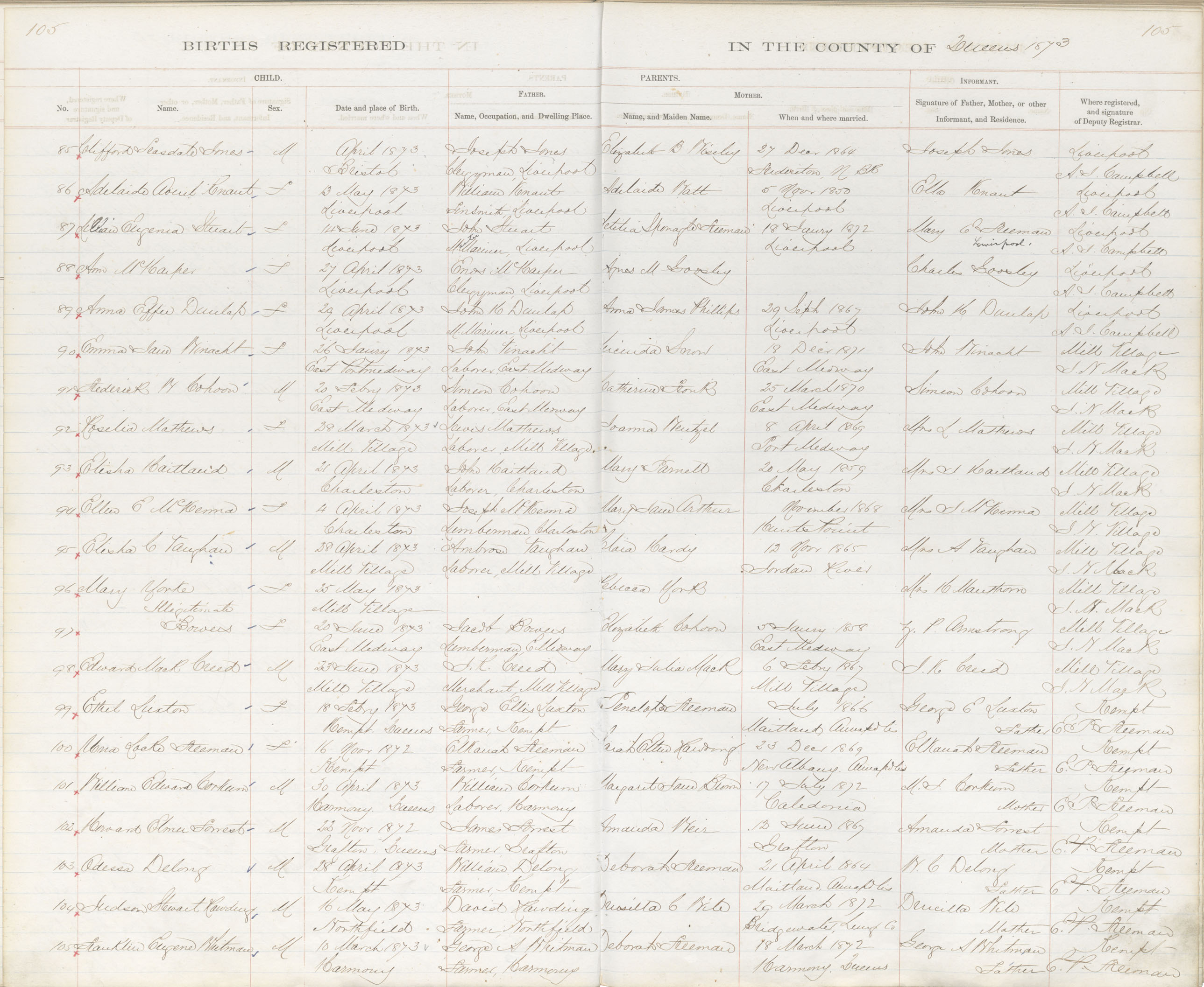 Birth Registration: Year: 1873 book: 1819 page: 105 number: 105