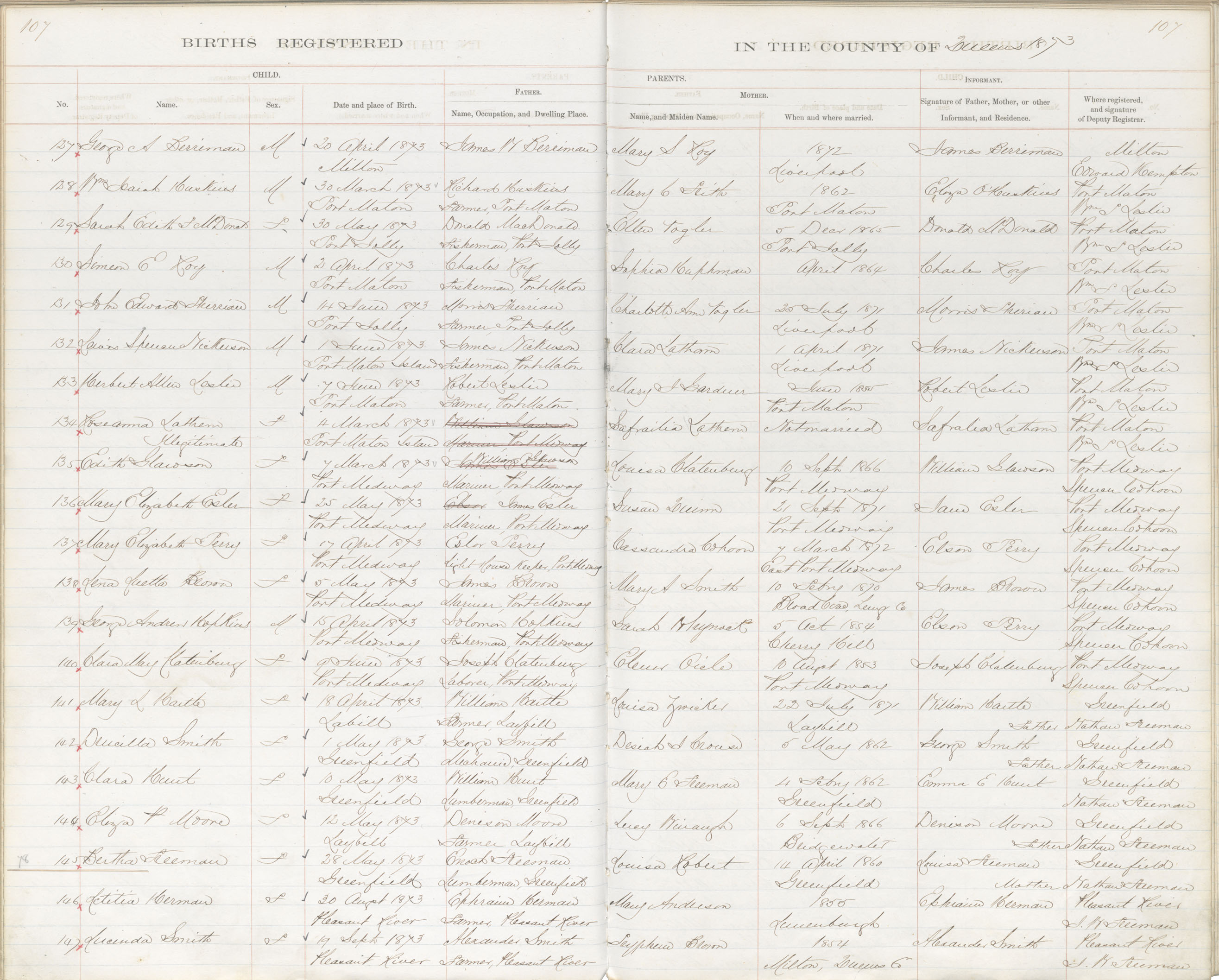 Birth Registration: Year: 1873 book: 1819 page: 107 number: 147