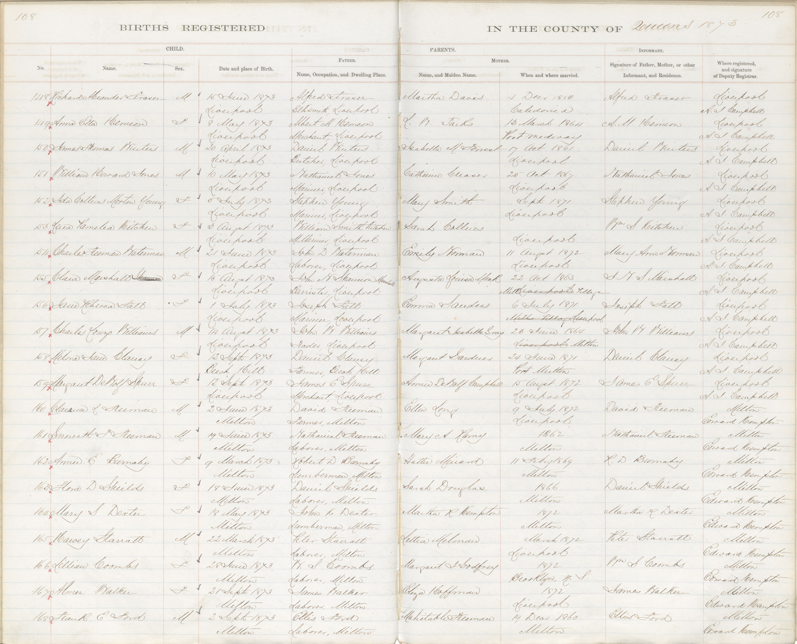 Birth Registration: Year: 1873 book: 1819 page: 108 number: 168