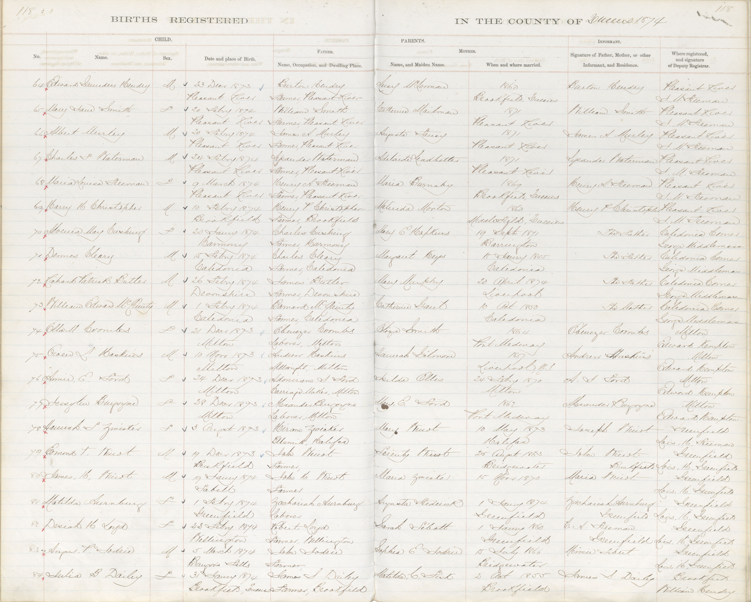 Birth Registration: Year: 1873 book: 1819 page: 118 number: 64