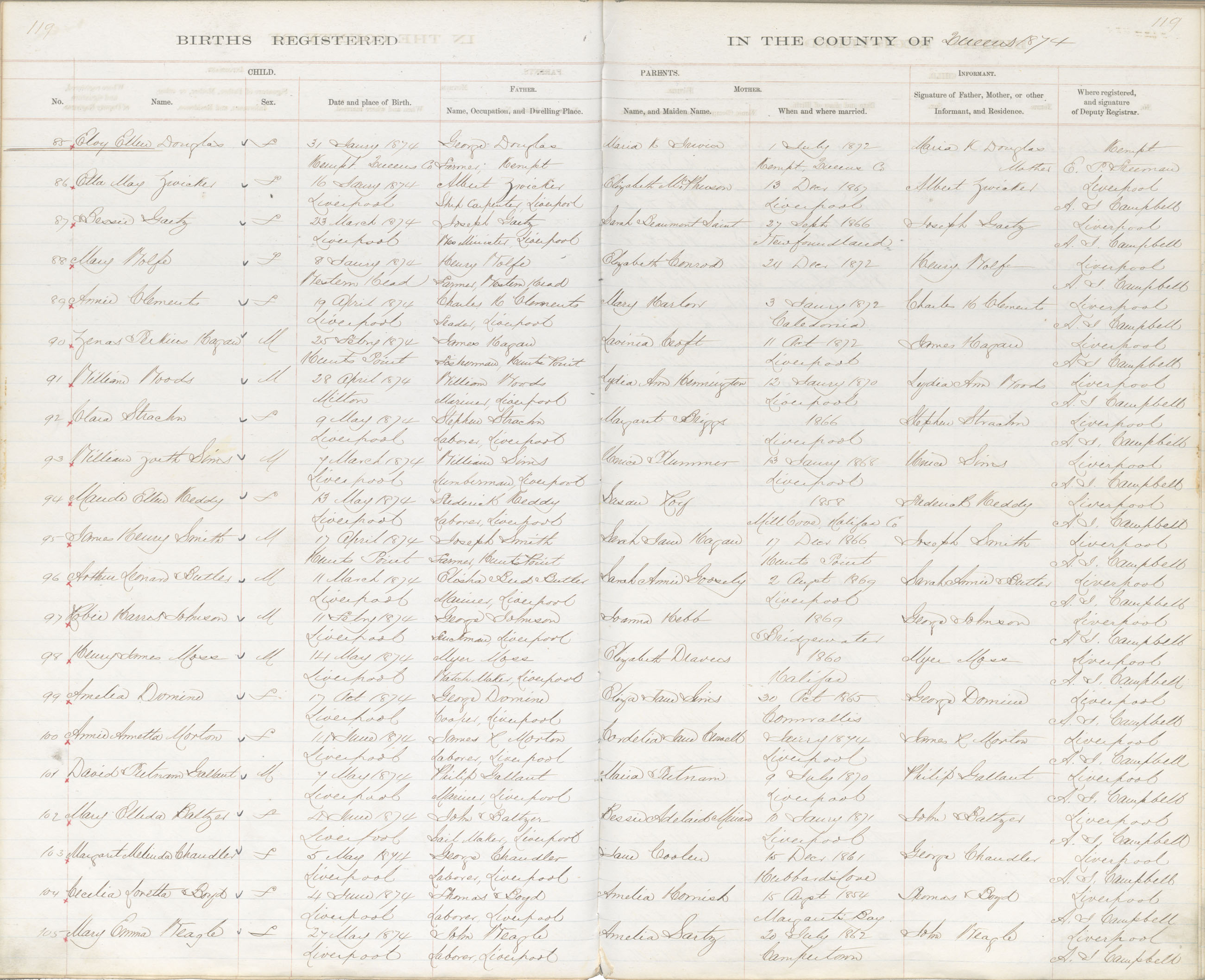 Birth Registration: Year: 1874 book: 1819 page: 119 number: 93