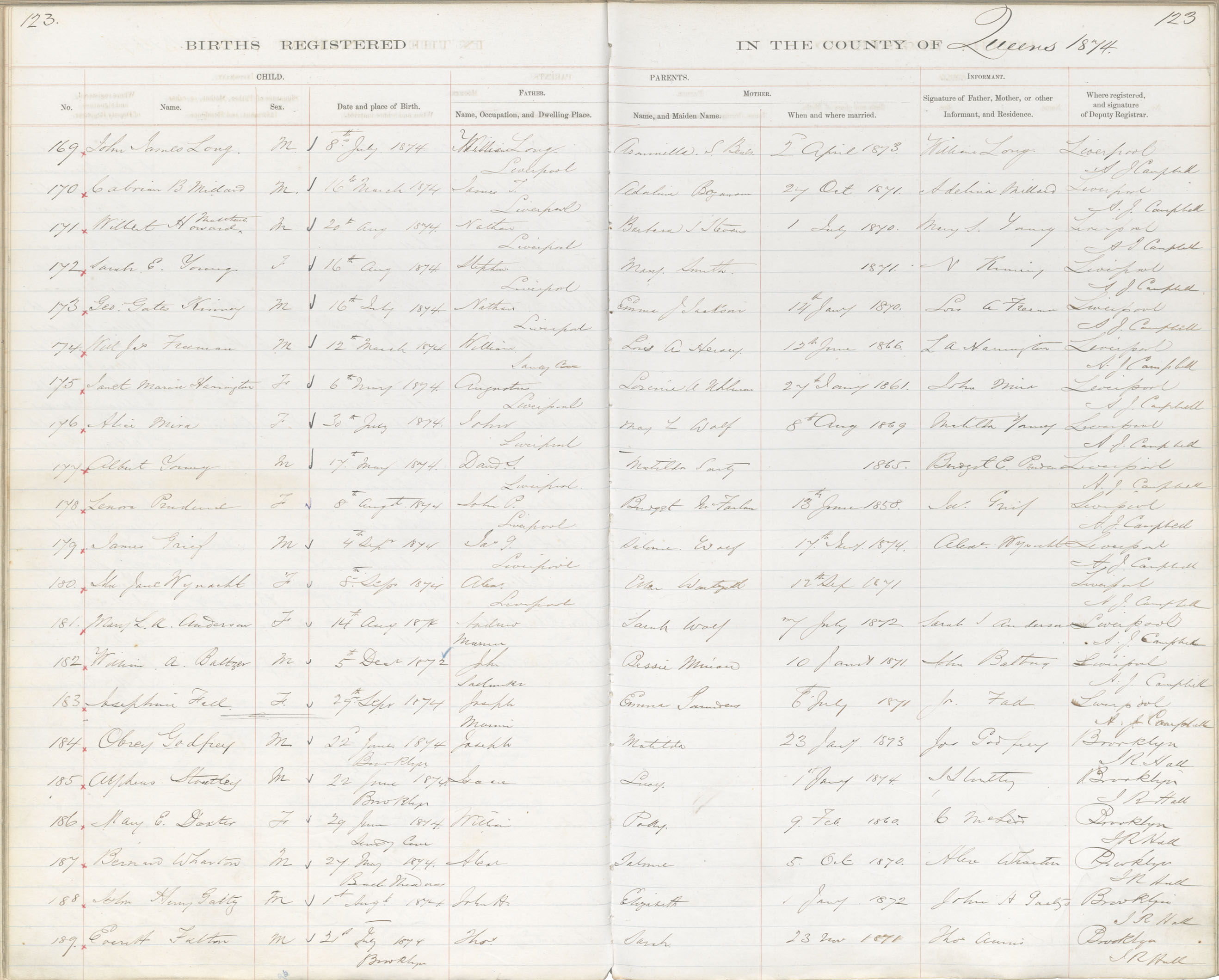 Birth Registration: Year: 1874 book: 1819 page: 123 number: 169