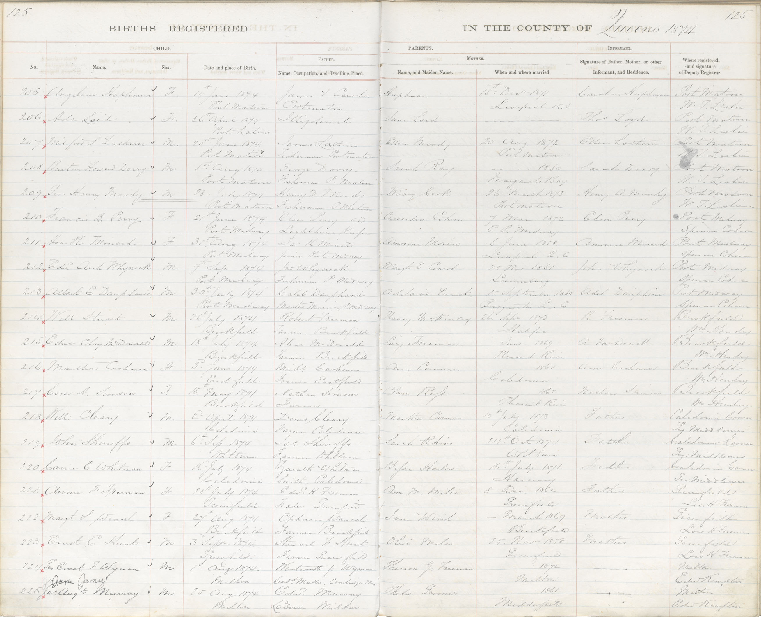 Birth Registration: Year: 1874 book: 1819 page: 125 number: 217