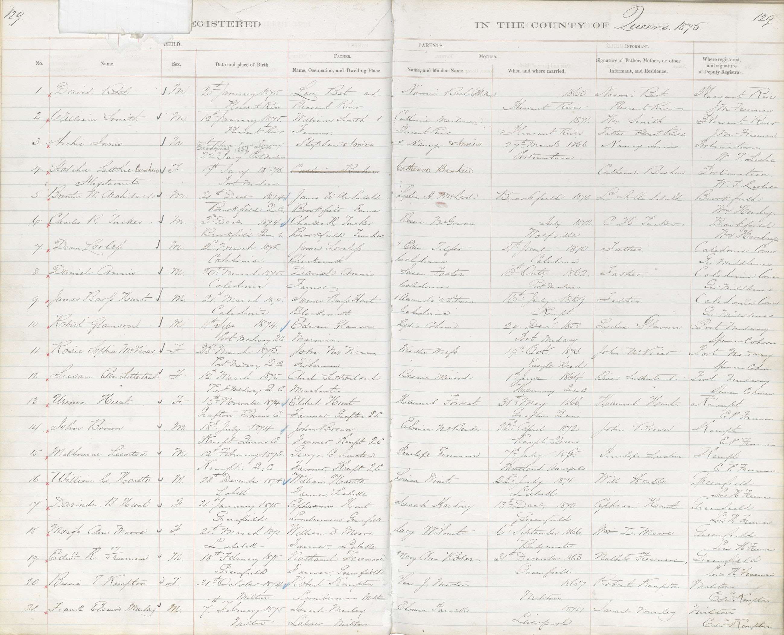 Birth Registration: Year: 1875 book: 1819 page: 129 number: 1