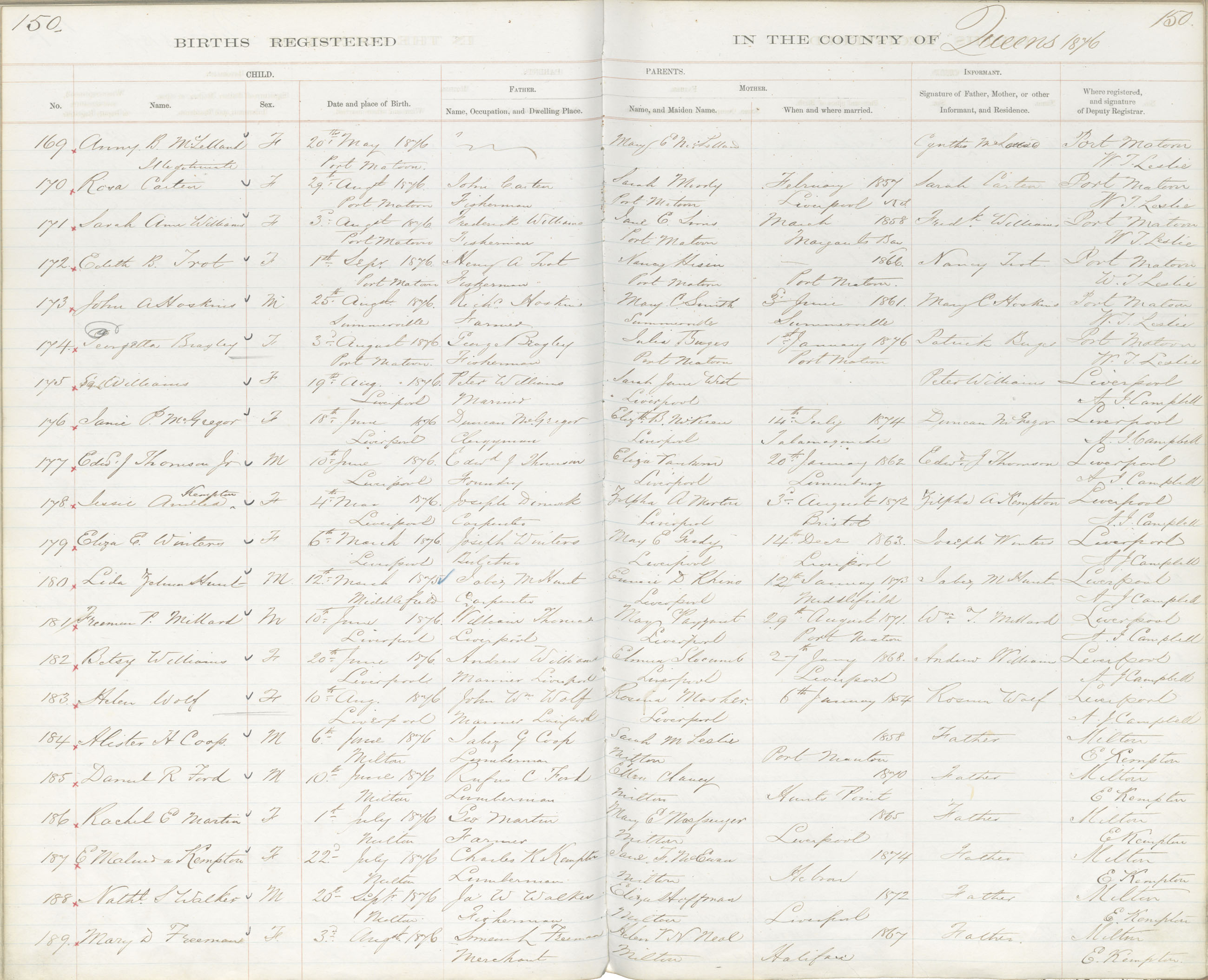 Birth Registration: Year: 1876 book: 1819 page: 150 number: 169