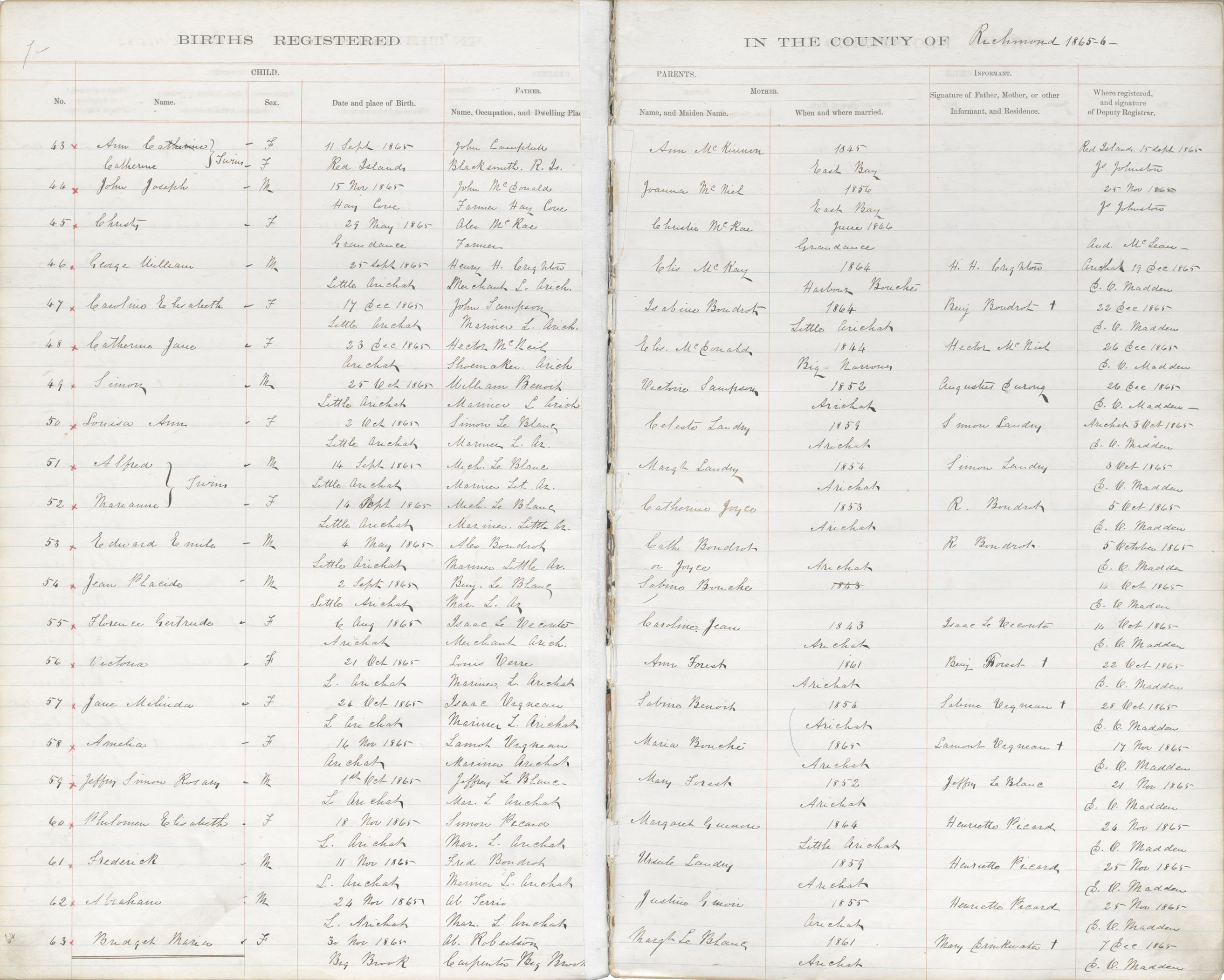 Male Birth Registration: Year: 1865 book: 1820 page: 7 number: 44