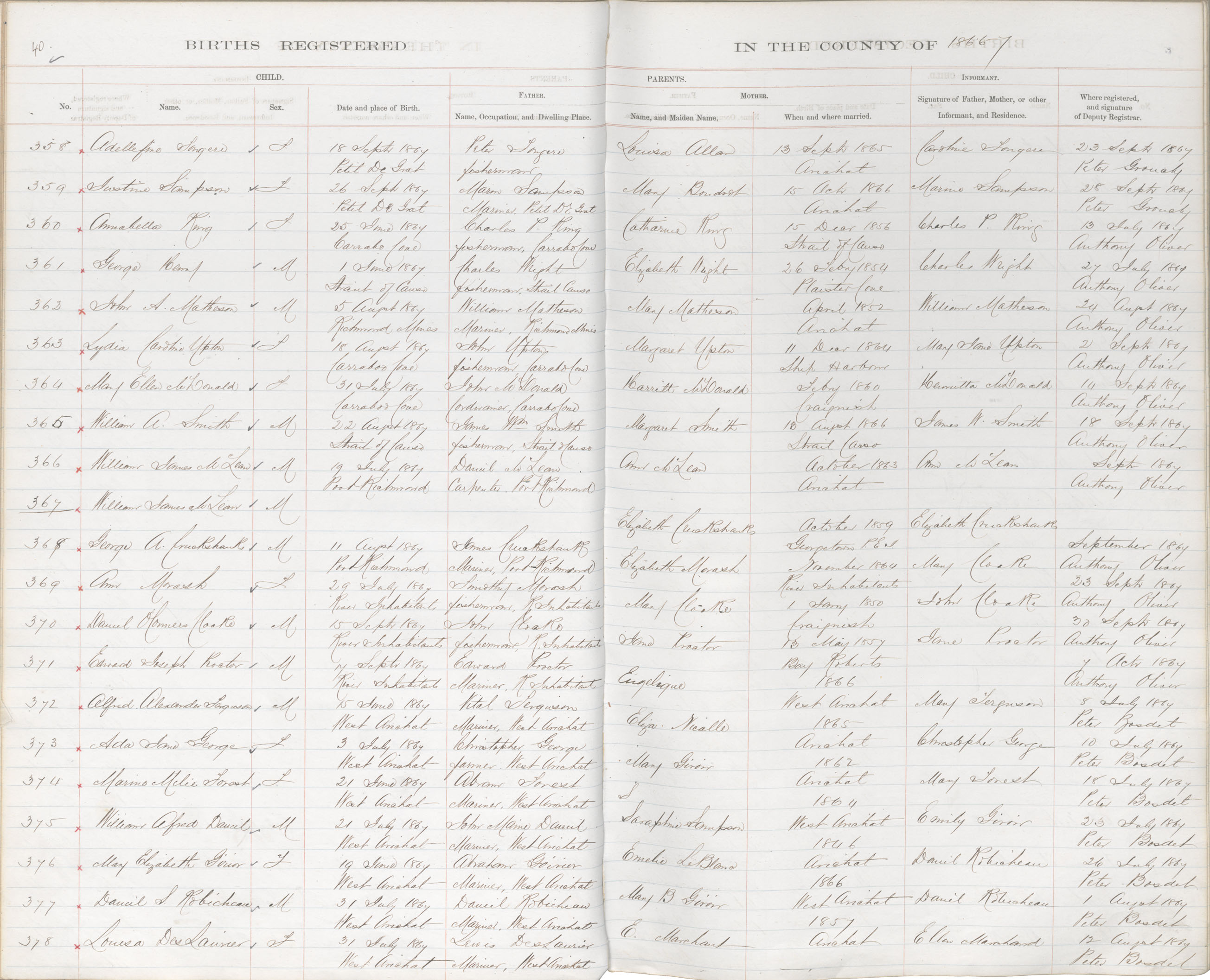 Female Birth Registration: Year: 1867 book: 1820 page: 40 number: 364