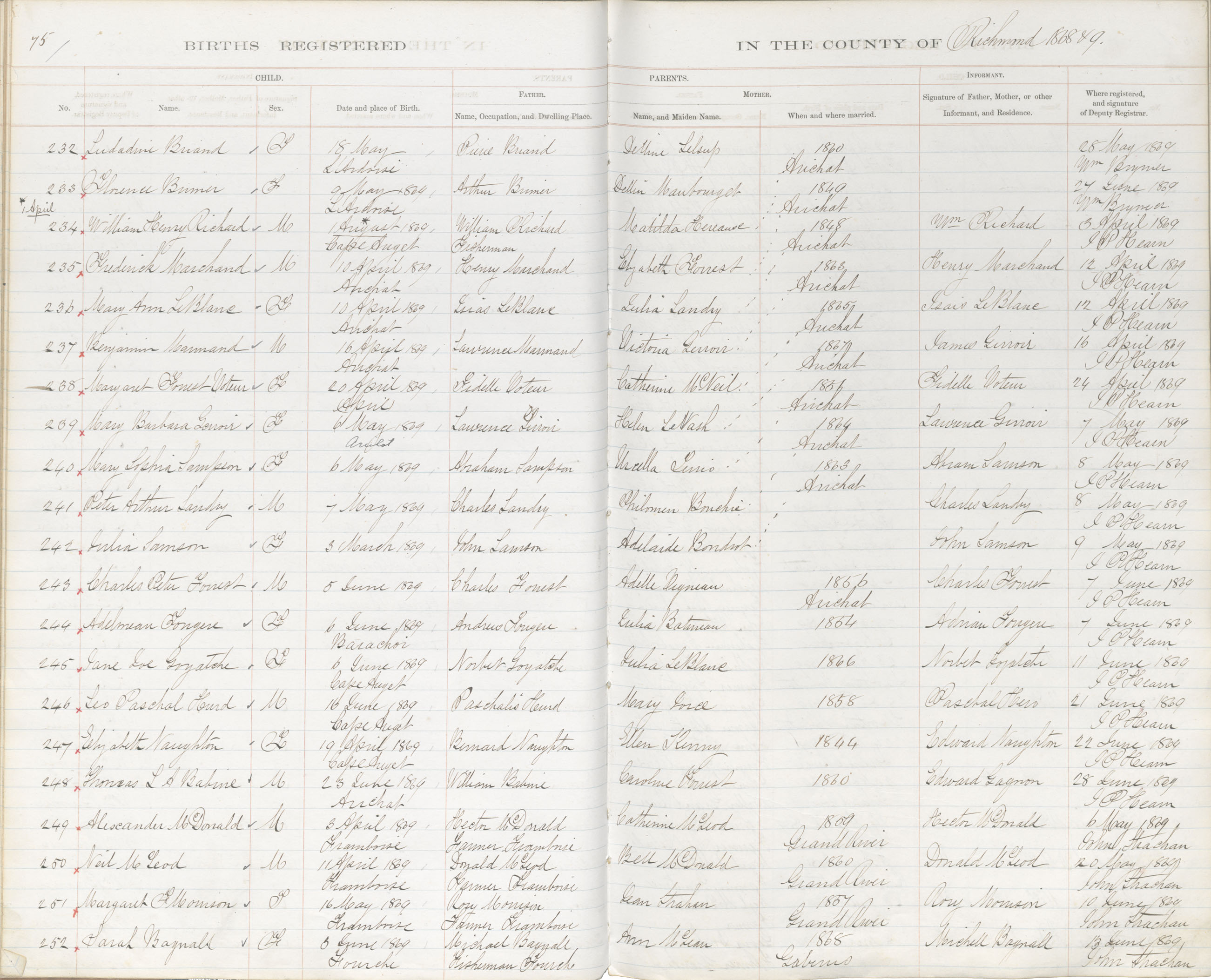 Male Birth Registration: Year: 1869 book: 1820 page: 75 number: 249