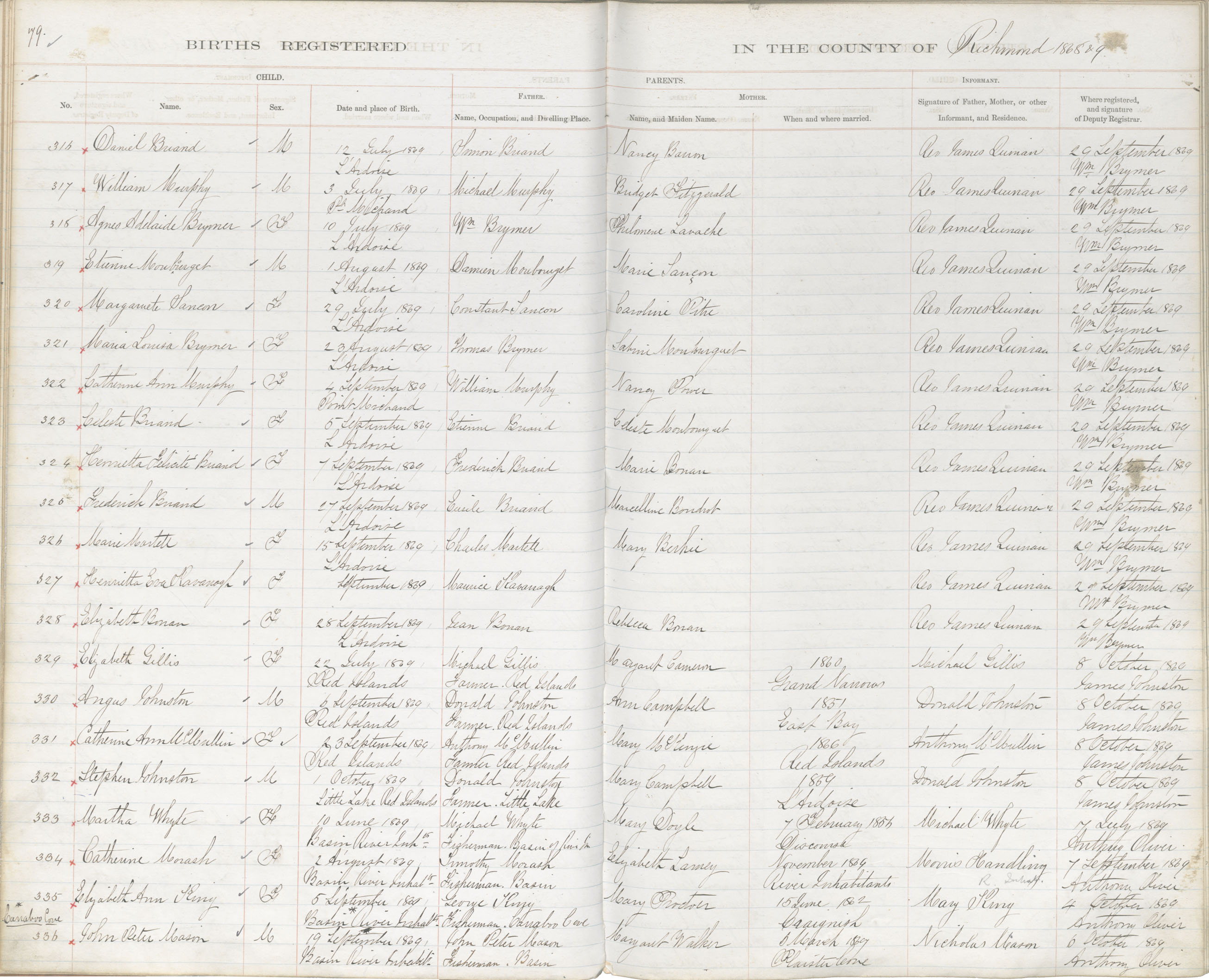 Male Birth Registration: Year: 1869 book: 1820 page: 79 number: 316