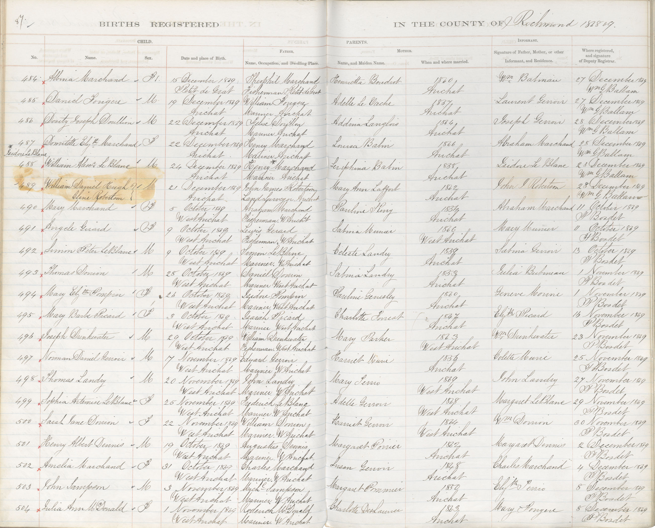 Male Birth Registration: Year: 1869 book: 1820 page: 87 number: 489