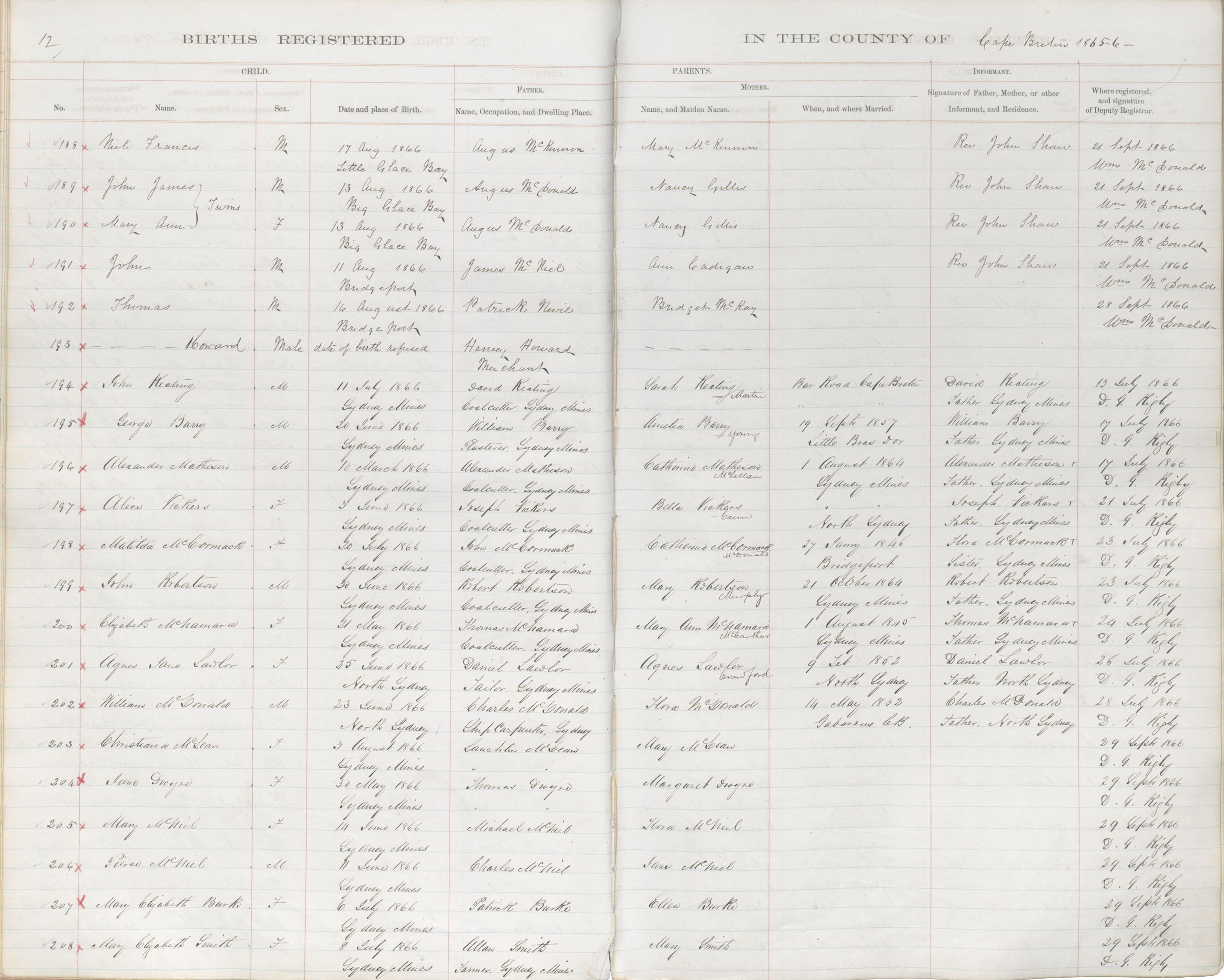 Male Birth Registration: Year: 1866 book: 1803 page: 12 number: 188