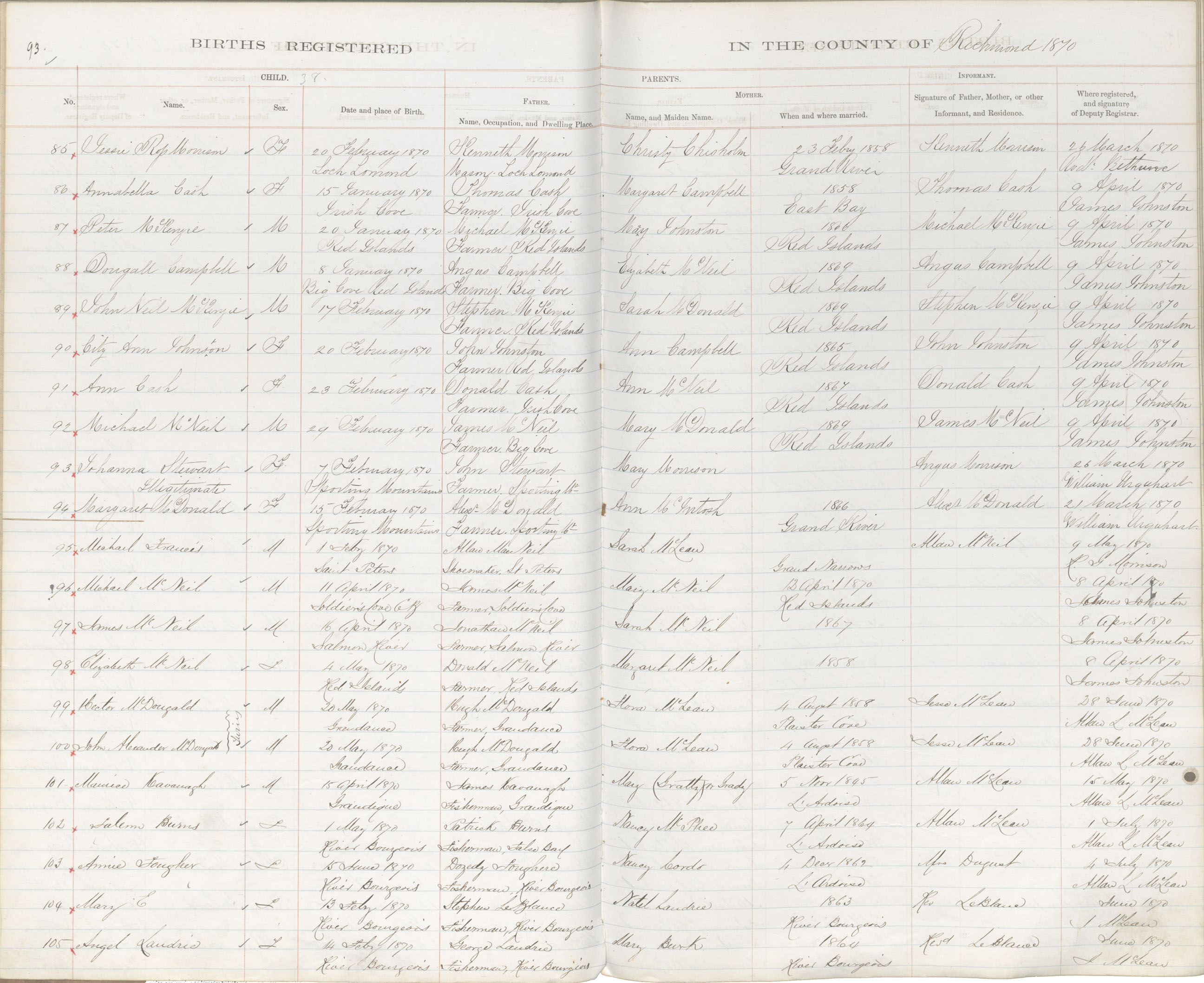 Female Birth Registration: Year: 1870 book: 1820 page: 93 number: 94