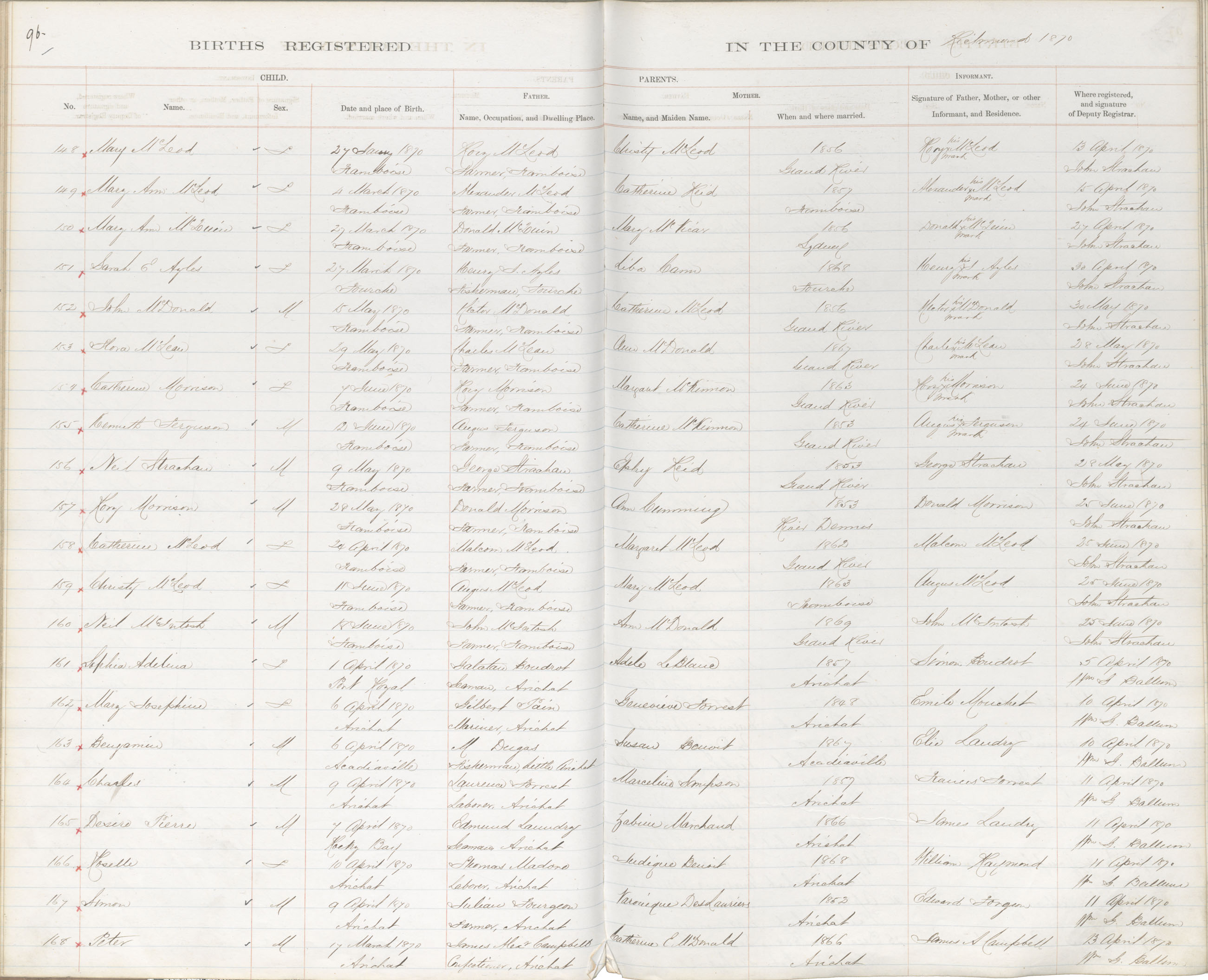 Male Birth Registration: Year: 1870 book: 1820 page: 96 number: 152