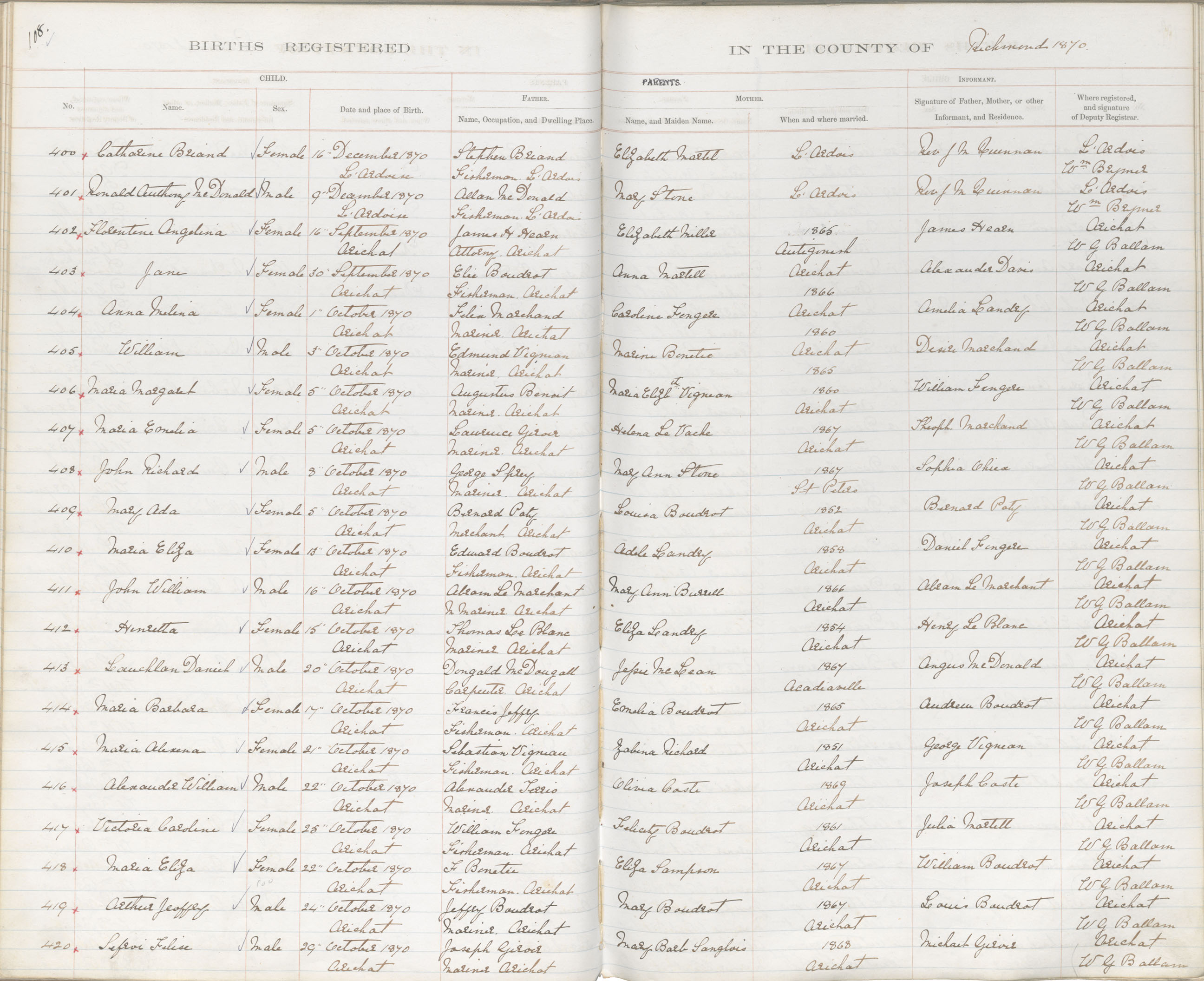 Male Birth Registration: Year: 1870 book: 1820 page: 108 number: 401