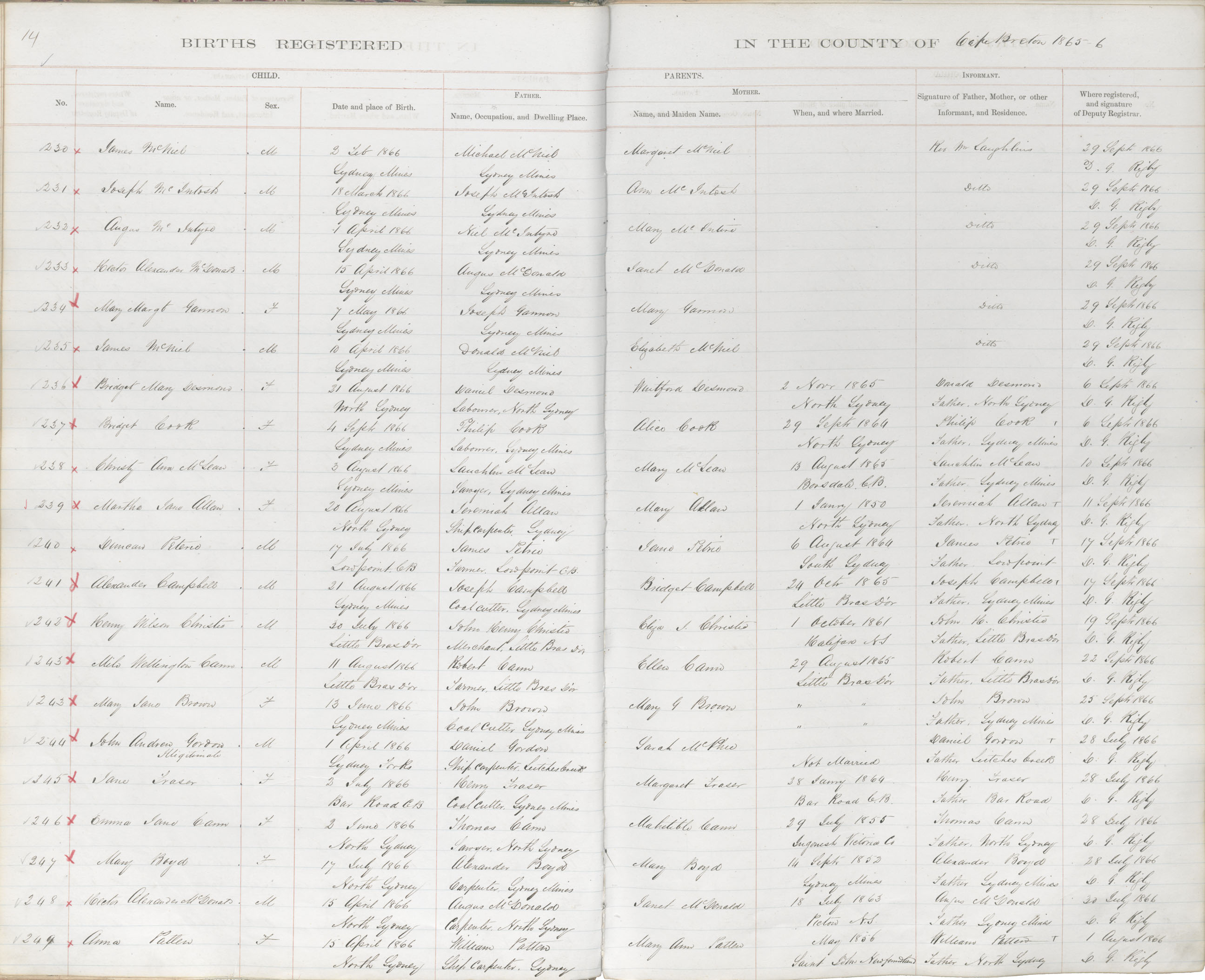 Female Birth Registration: Year: 1866 book: 1803 page: 14 number: 249