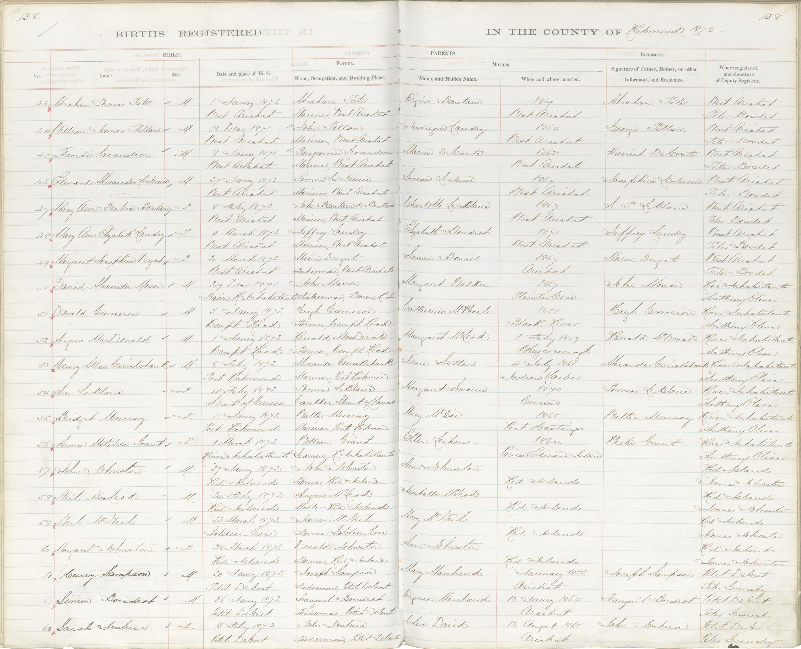 Male Birth Registration: Year: 1872 book: 1820 page: 138 number: 52