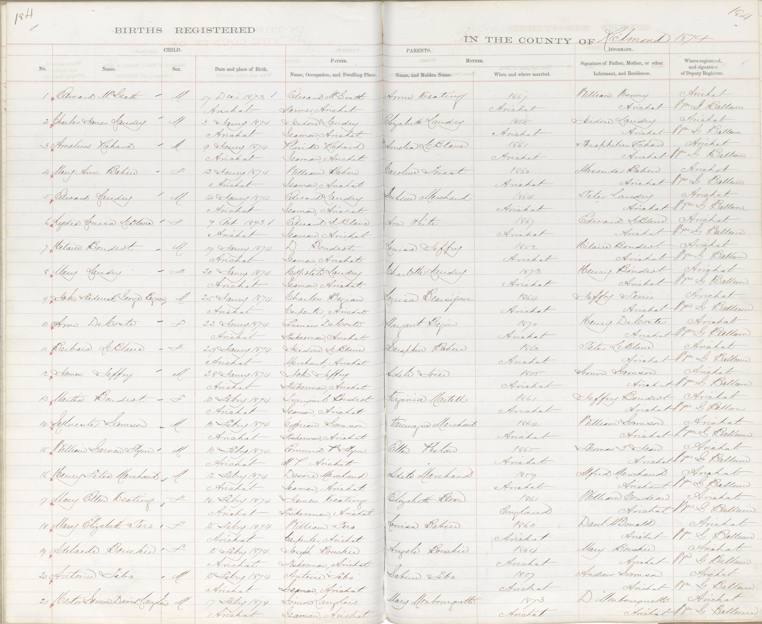 Male Birth Registration: Year: 1873 book: 1820 page: 184 number: 1
