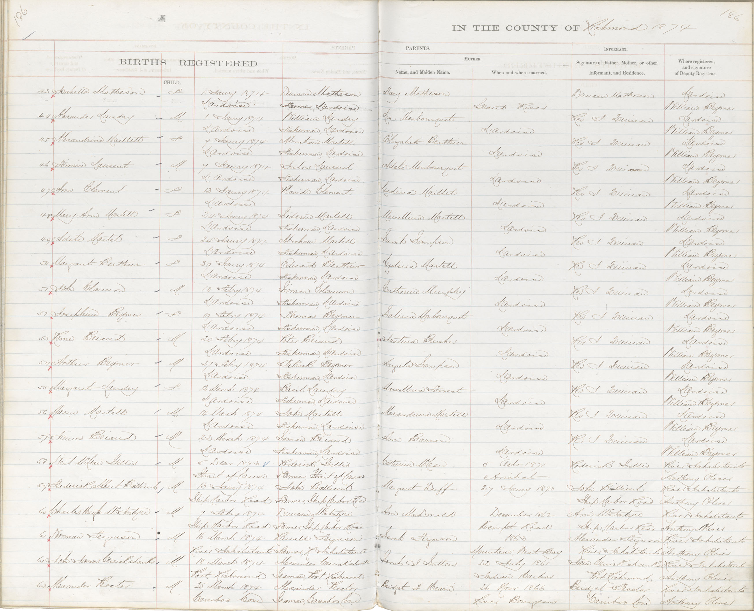 Male Birth Registration: Year: 1874 book: 1820 page: 186 number: 63