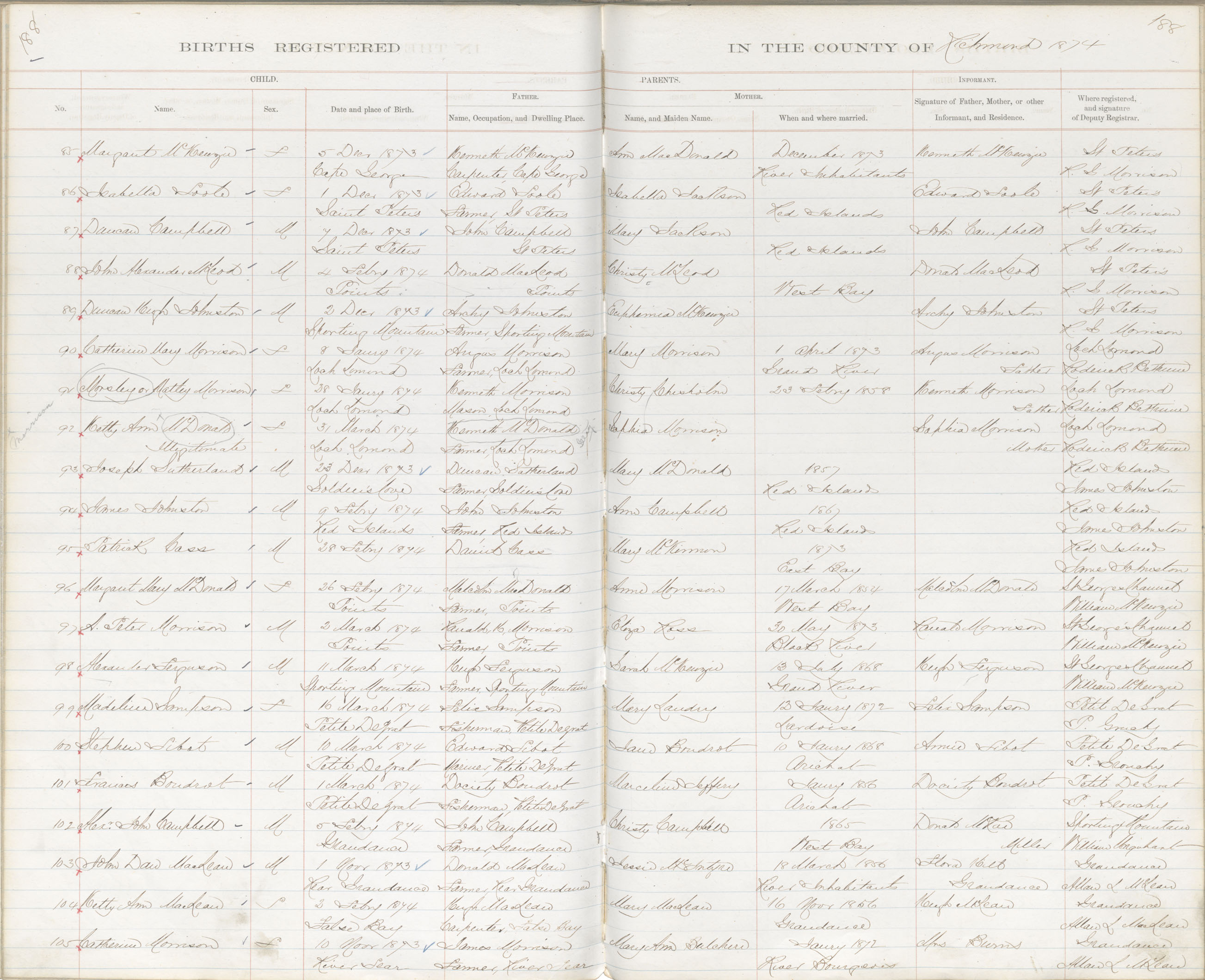 Female Birth Registration: Year: 1874 book: 1820 page: 188 number: 92
