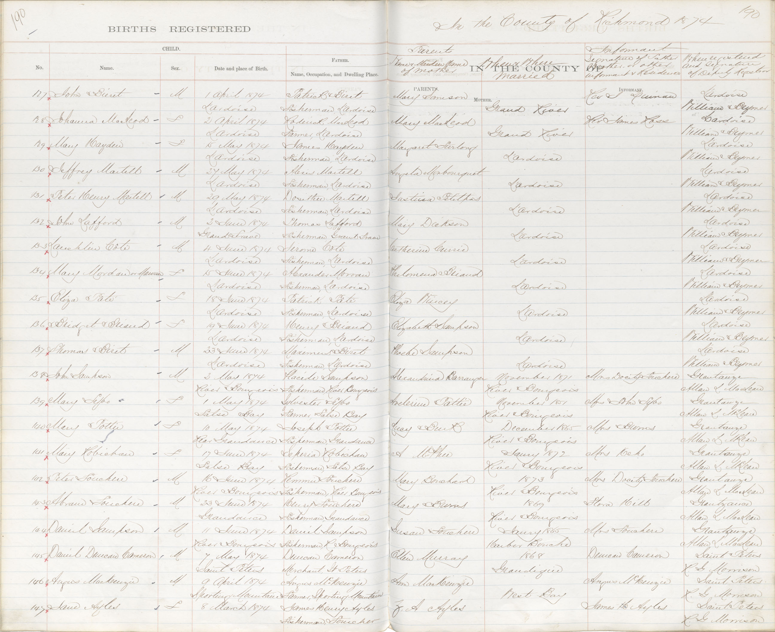 Female Birth Registration: Year: 1874 book: 1820 page: 190 number: 147