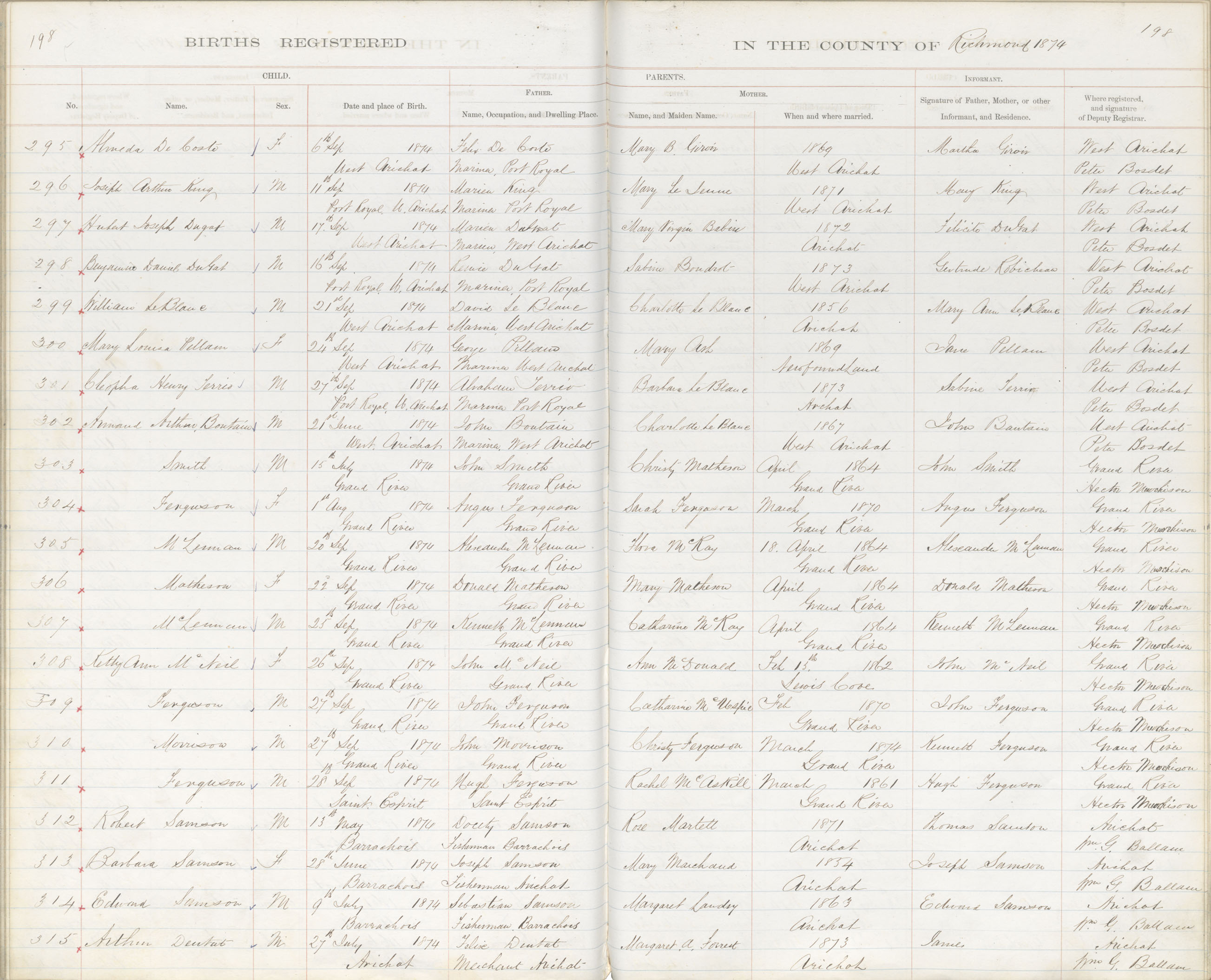 Male Birth Registration: Year: 1874 book: 1820 page: 198 number: 315