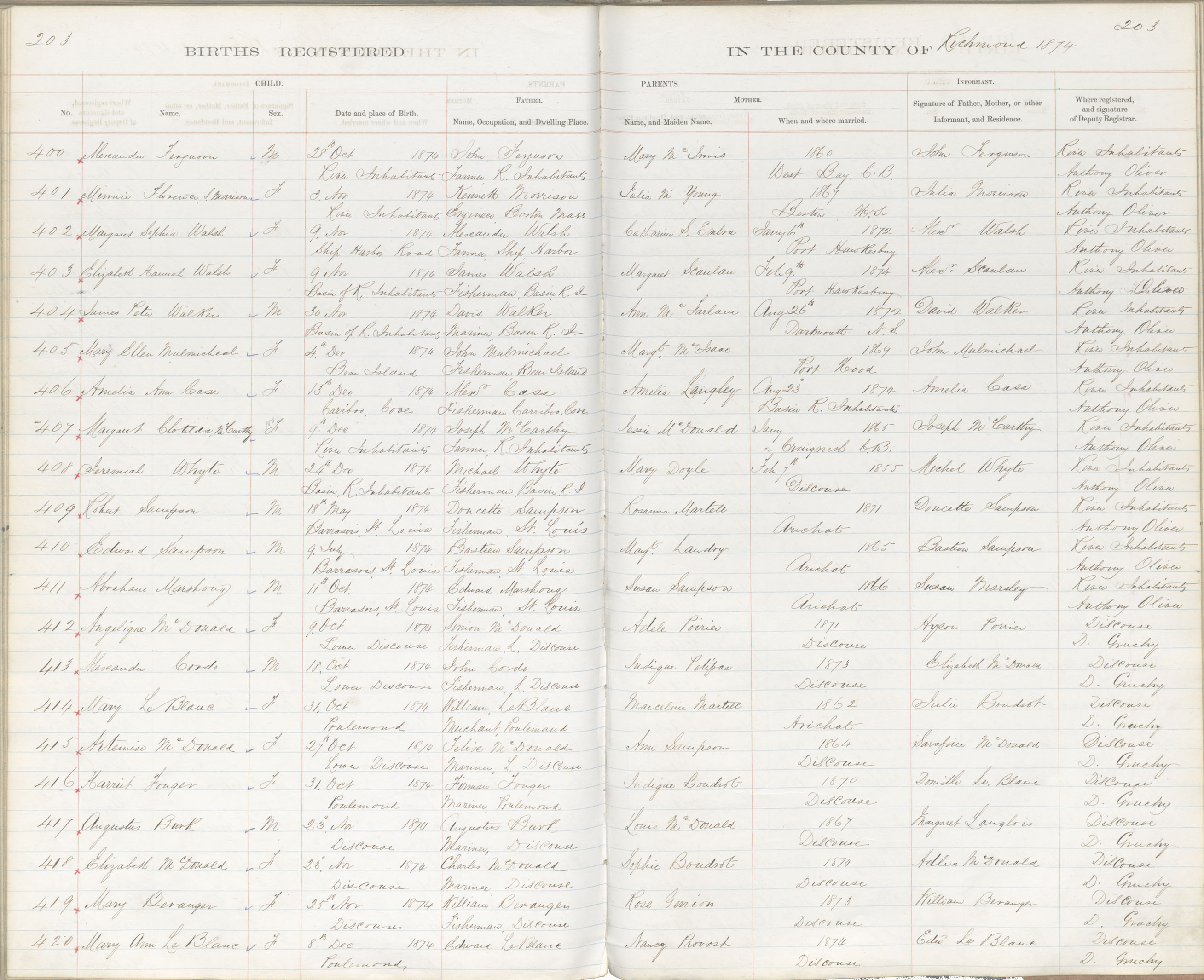 Female Birth Registration: Year: 1874 book: 1820 page: 203 number: 418