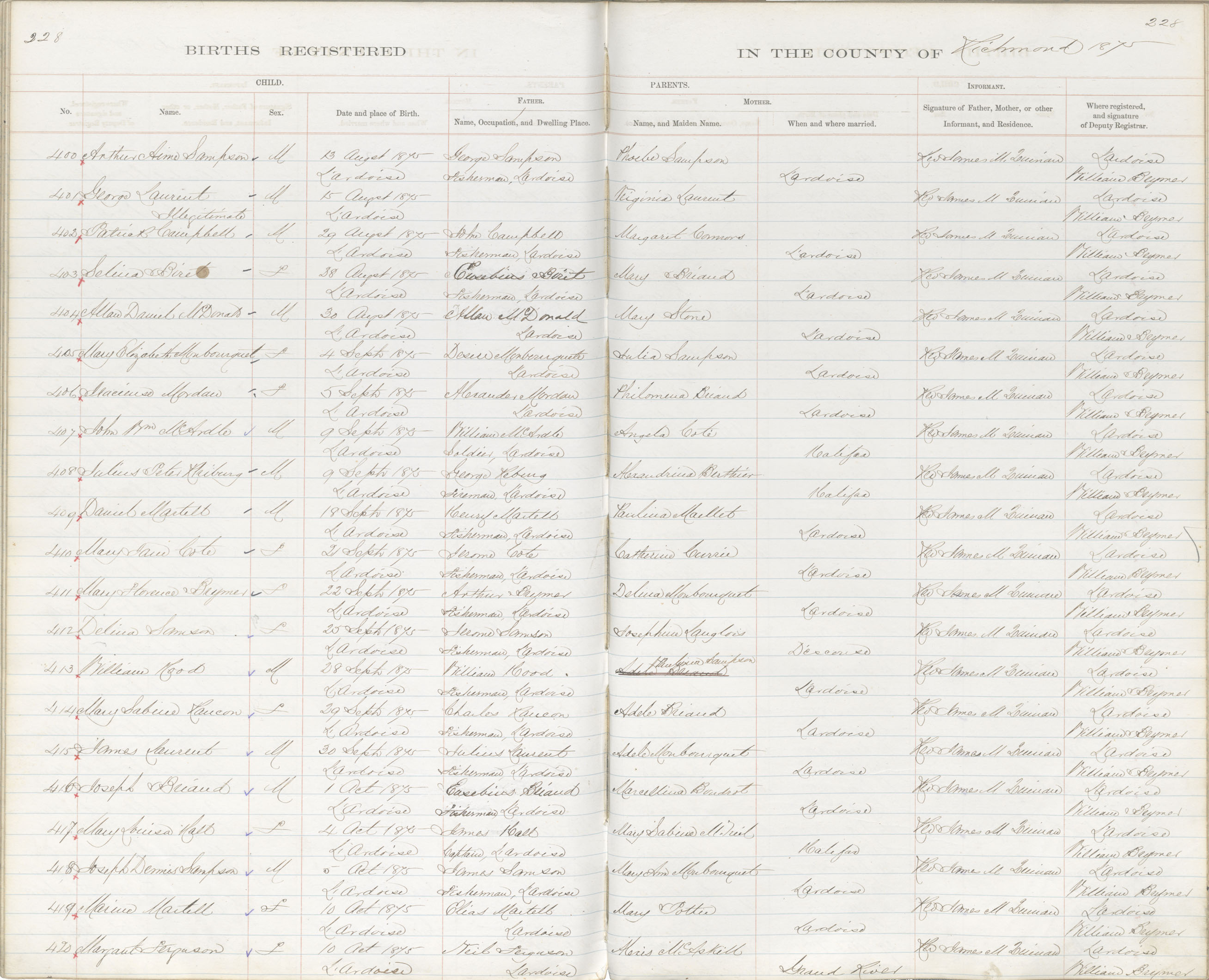 Male Birth Registration: Year: 1875 book: 1820 page: 228 number: 404
