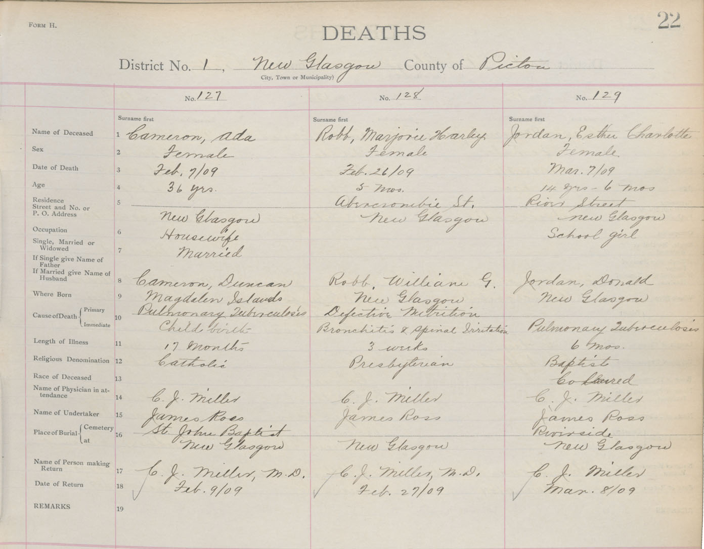 Death Registration: Year: 1909 book: 14 page: 22 number: 129