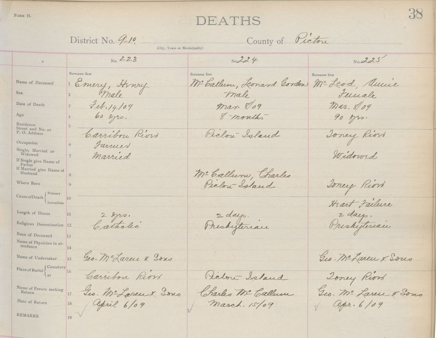 Death Registration: Year: 1909 book: 14 page: 38 number: 225