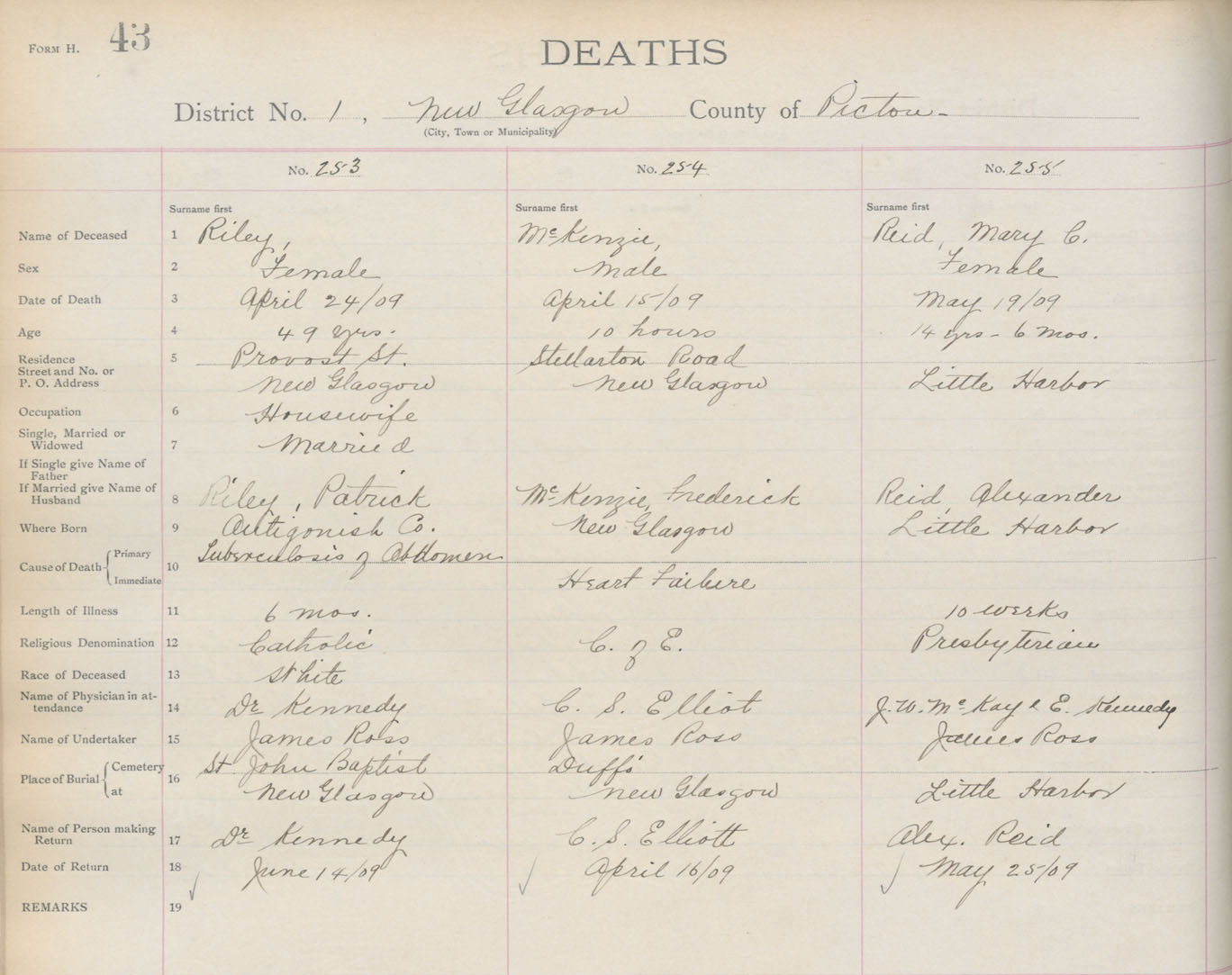 Death Registration: Year: 1909 book: 14 page: 43 number: 255