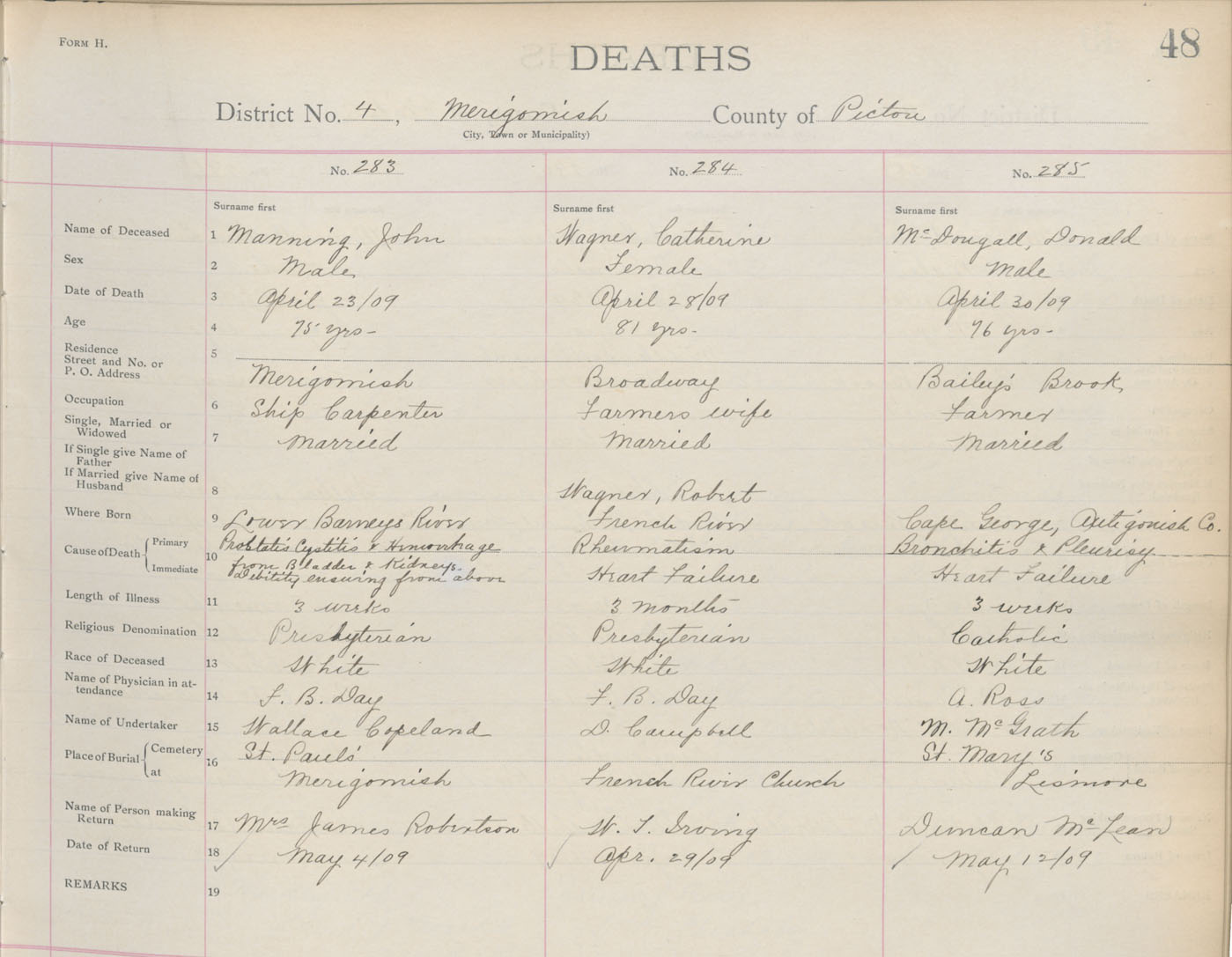 Death Registration: Year: 1909 book: 14 page: 48 number: 285