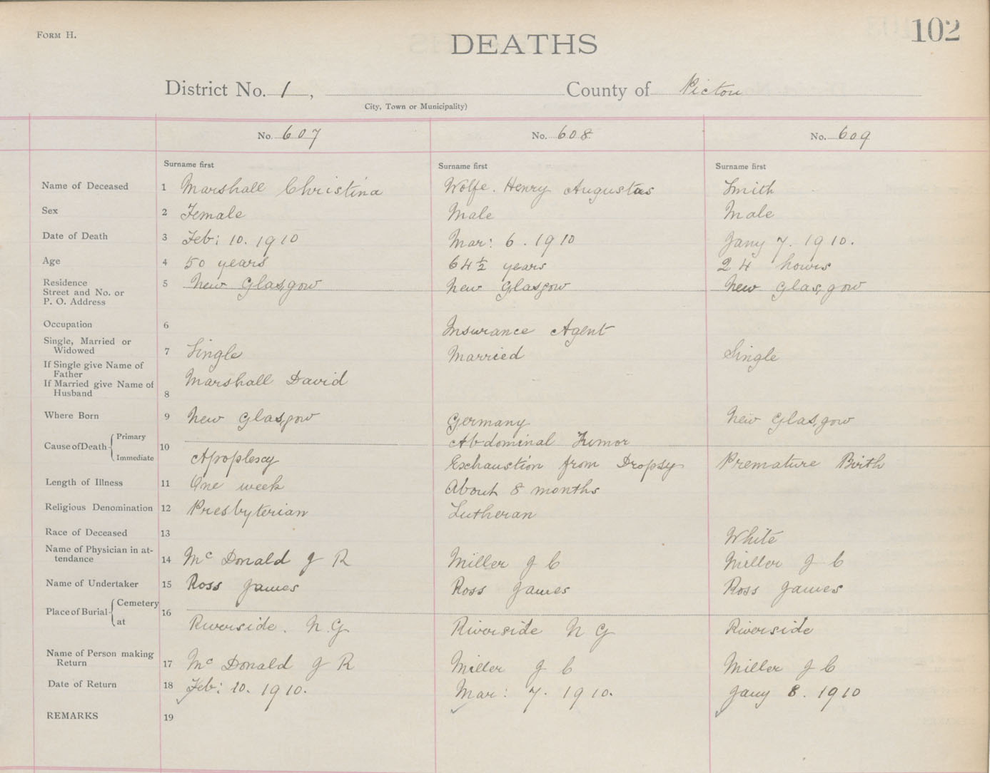 Death Registration: Year: 1910 book: 14 page: 102 number: 607