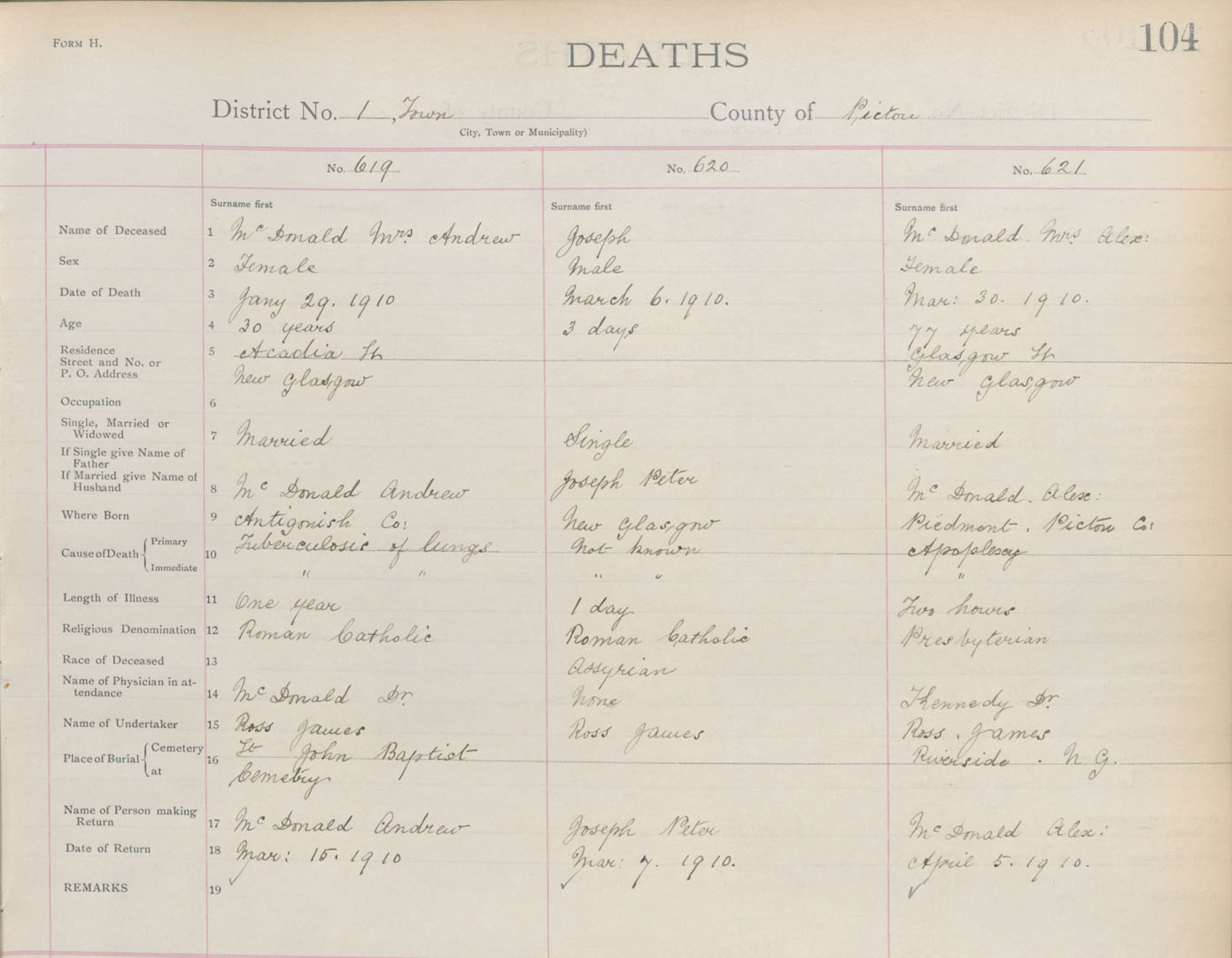 Death Registration: Year: 1910 book: 14 page: 104 number: 619